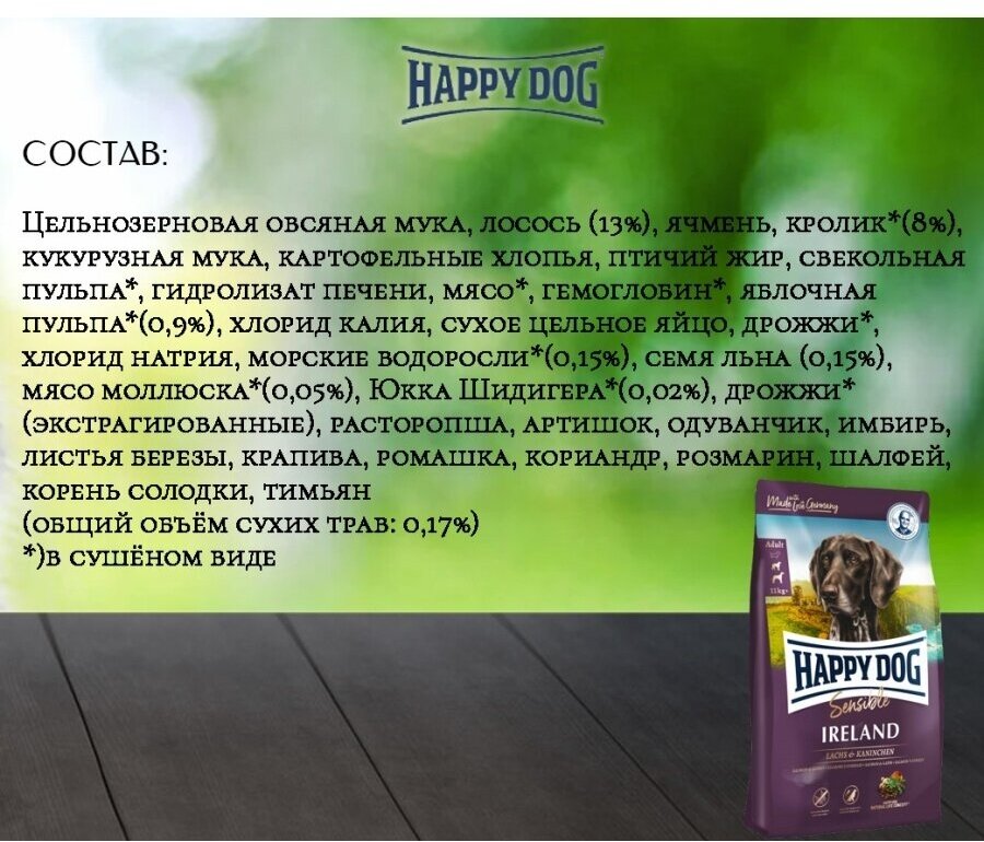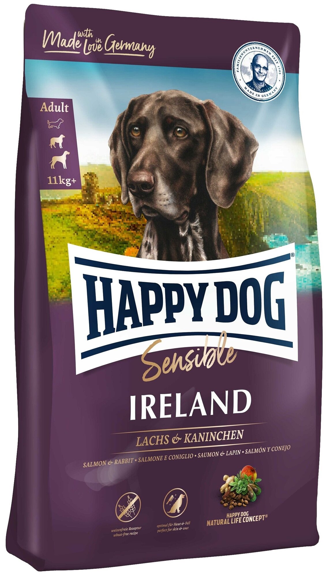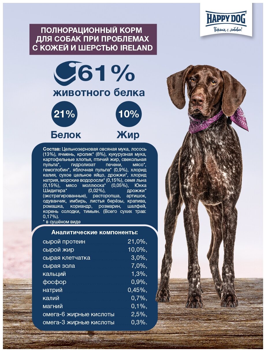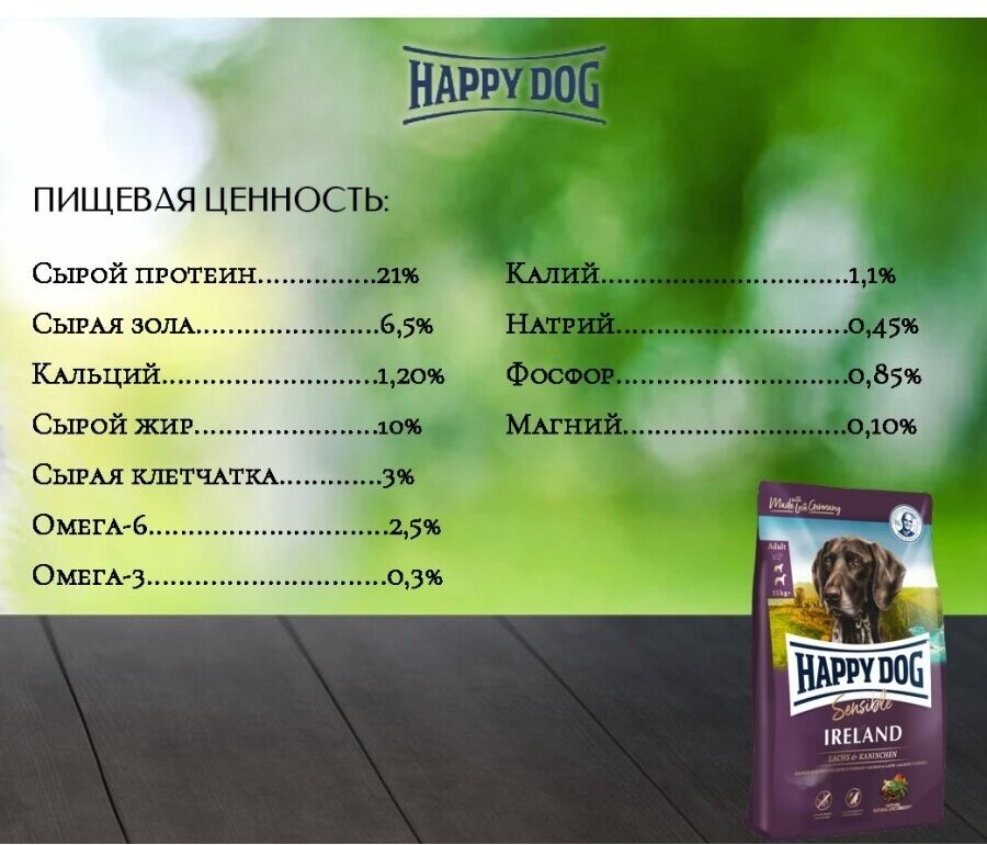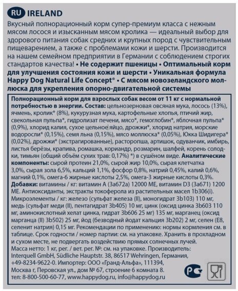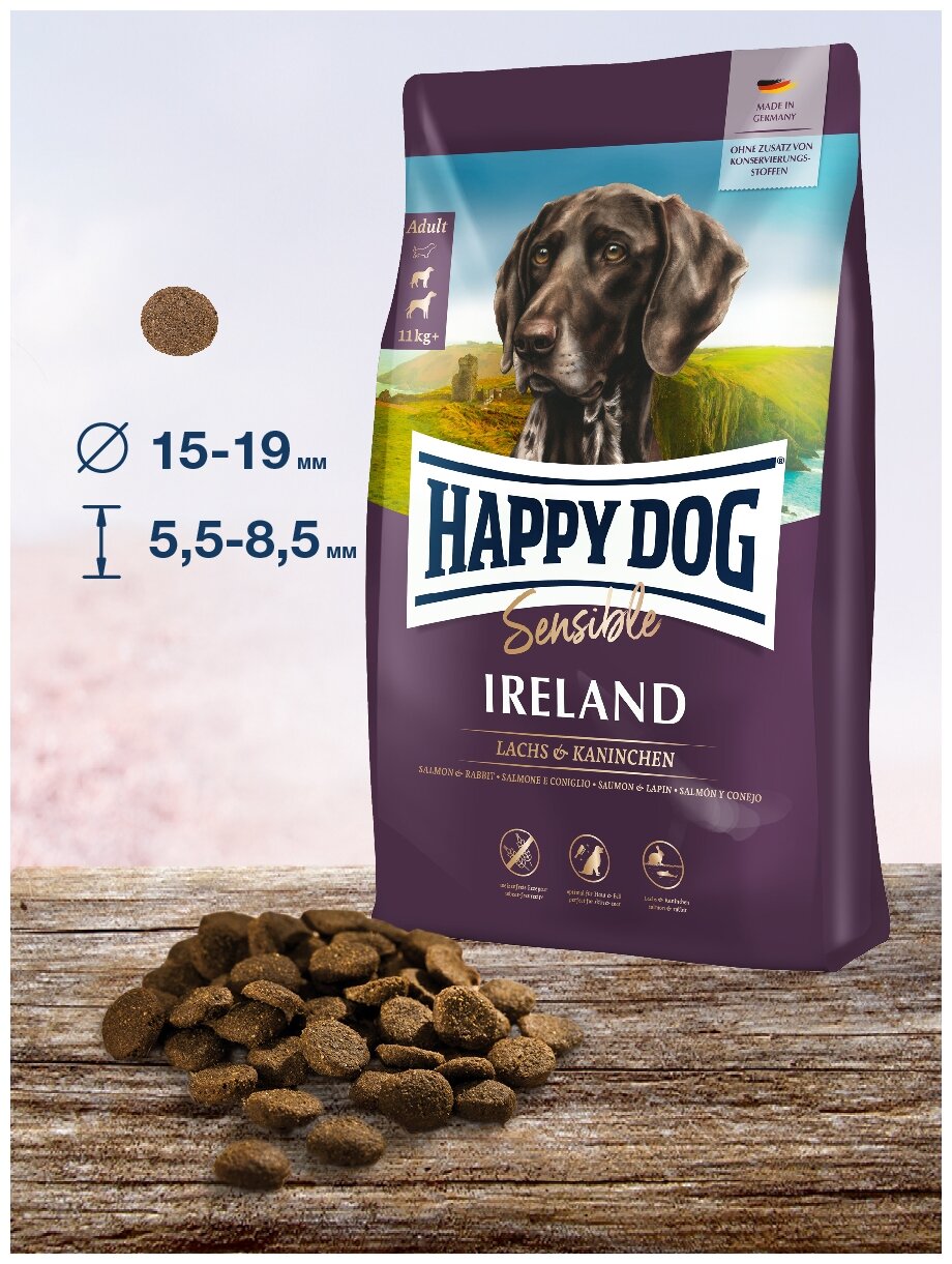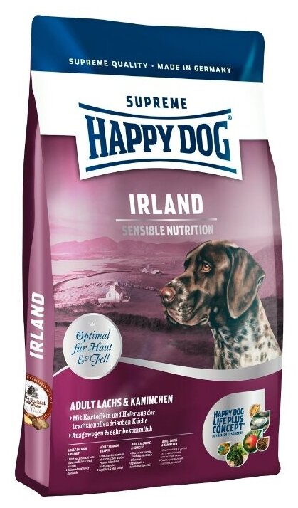 Happy Dog предлагает уникальную возможность всем привередливым и разборчивым в еде гурманам: необыкновенно вкусный полнорационный корм суперпремиум класса Irland, изготовленный из нежного лосося и вкусного кролика. Благодаря тщательно подобранным компонентам, особо бережной технологии приготовления и оптимизированному уровню белков и энергии корм Happy Dog Irland отлично подходит для кормления чувствительных к кормам собак с учетом их особых потребностей. Специальная форма гранул этого корма оптимально соответствует форме челюстей собак средних и крупных пород. Эксклюзивная рецептура этого корма дополнена уникальным Natural Life Concept из натуральных ингредиентов. Произведен в Германии под строжайшим контролем качества.