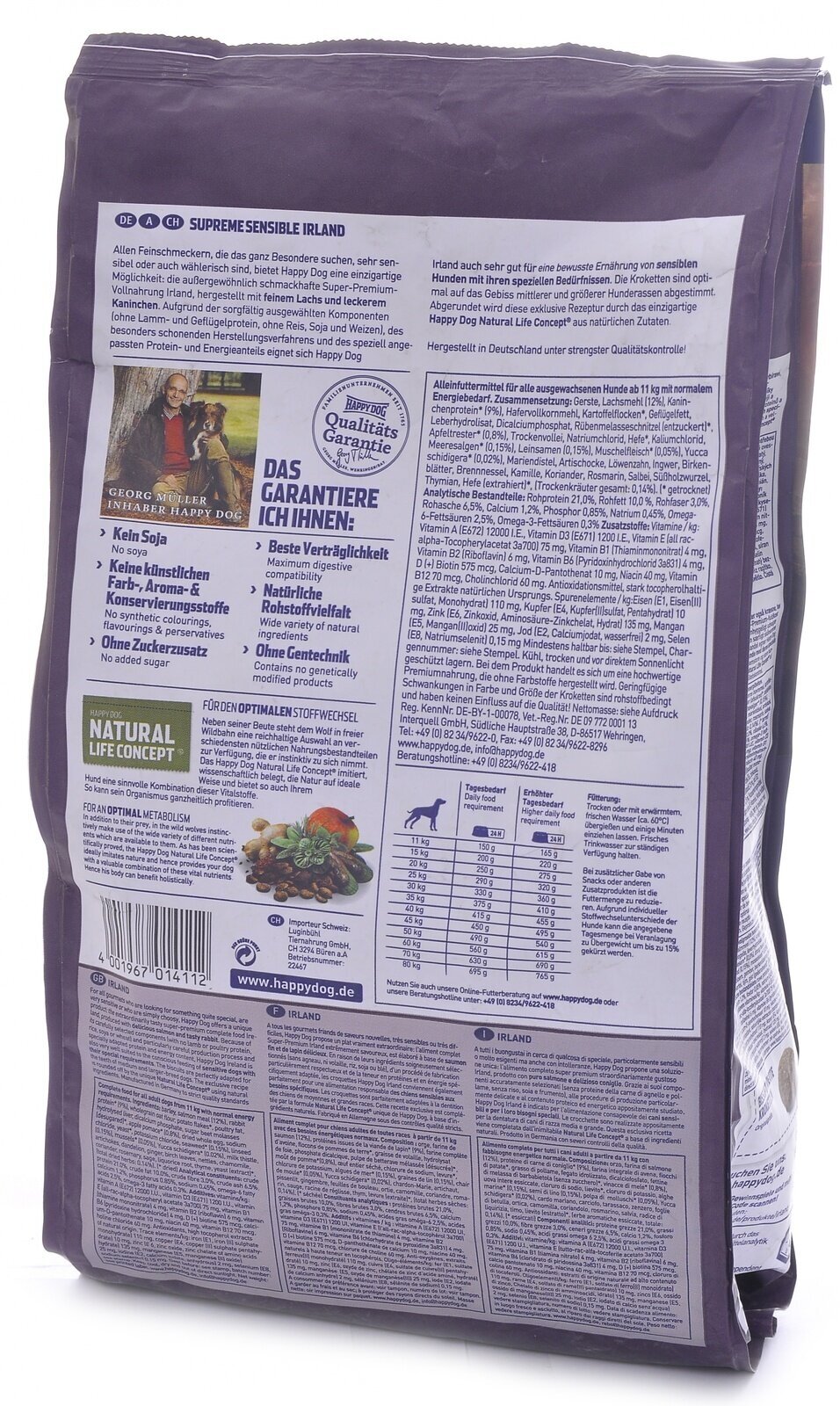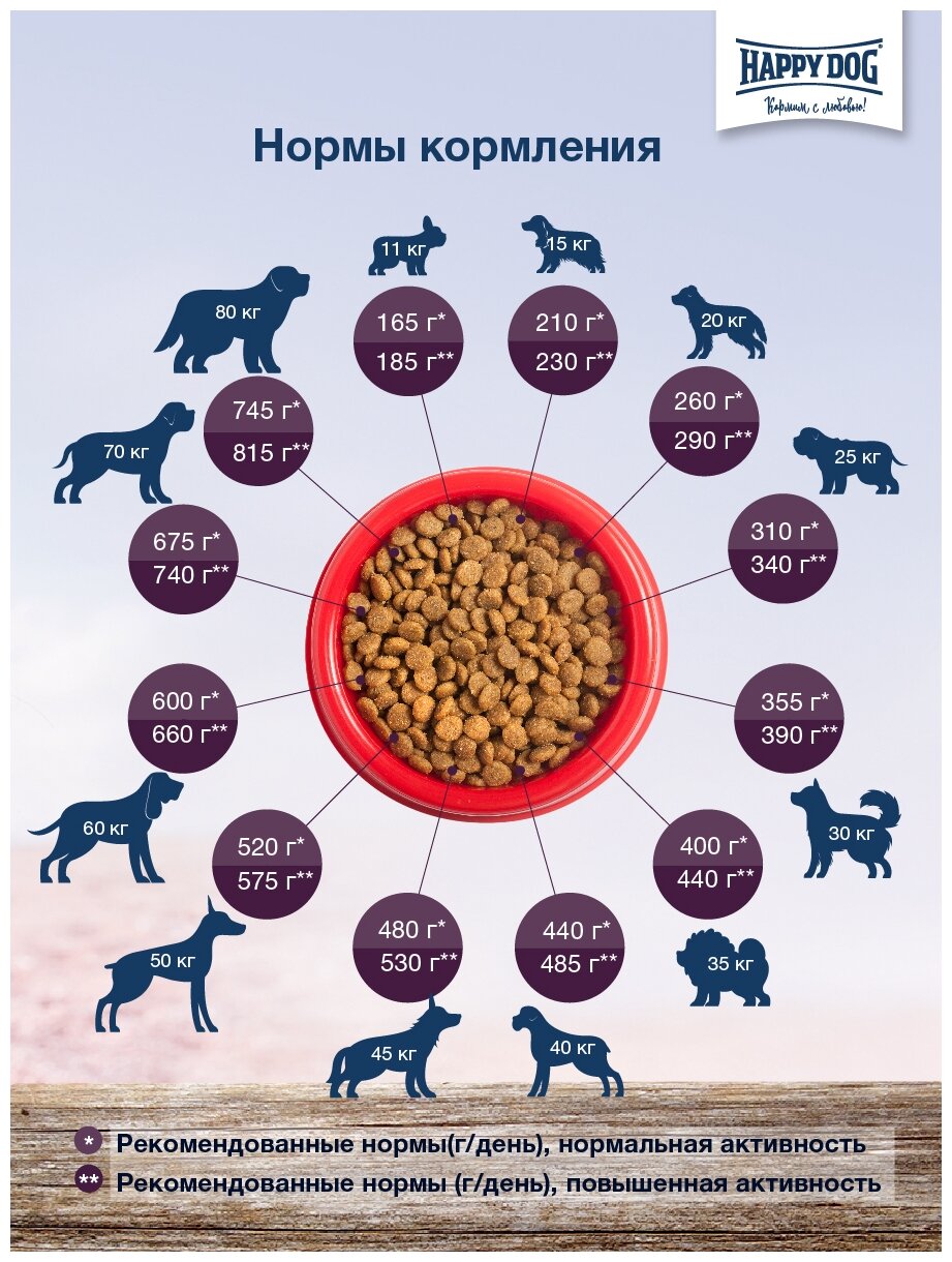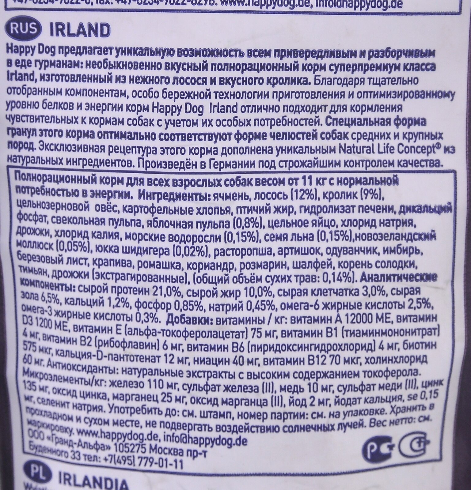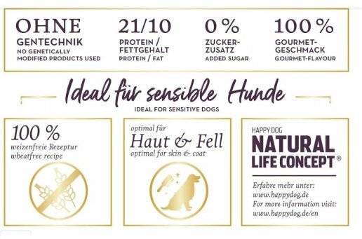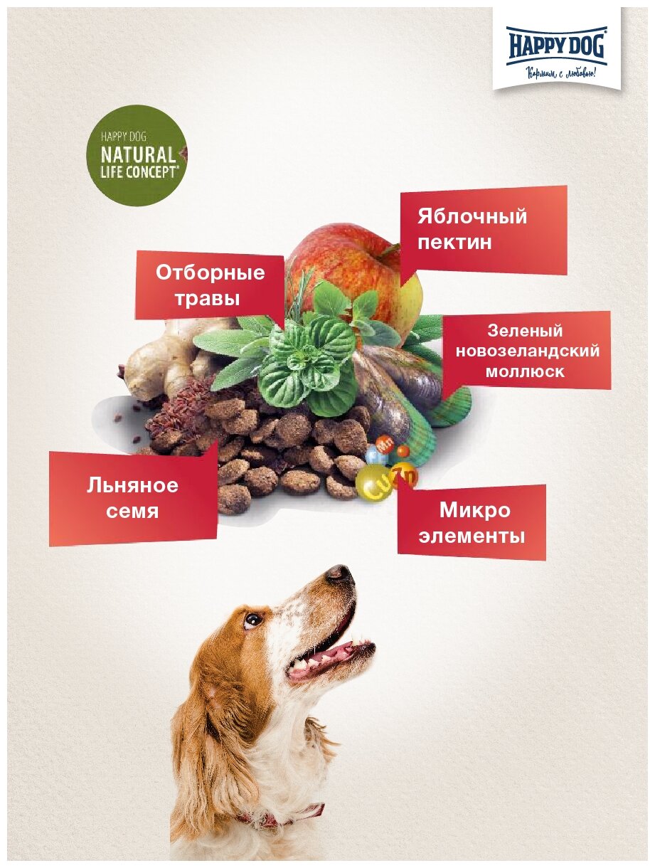 Happy Dog предлагает уникальную возможность всем привередливым и разборчивым в еде гурманам: необыкновенно вкусный полнорационный корм суперпремиум класса Irland, изготовленный из нежного лосося и вкусного кролика. Благодаря тщательно подобранным компонентам, особо бережной технологии приготовления и оптимизированному уровню белков и энергии корм Happy Dog Irland отлично подходит для кормления чувствительных к кормам собак с учетом их особых потребностей. Специальная форма гранул этого корма оптимально соответствует форме челюстей собак средних и крупных пород. Эксклюзивная рецептура этого корма дополнена уникальным Natural Life Concept из натуральных ингредиентов. Произведен в Германии под строжайшим контролем качества.