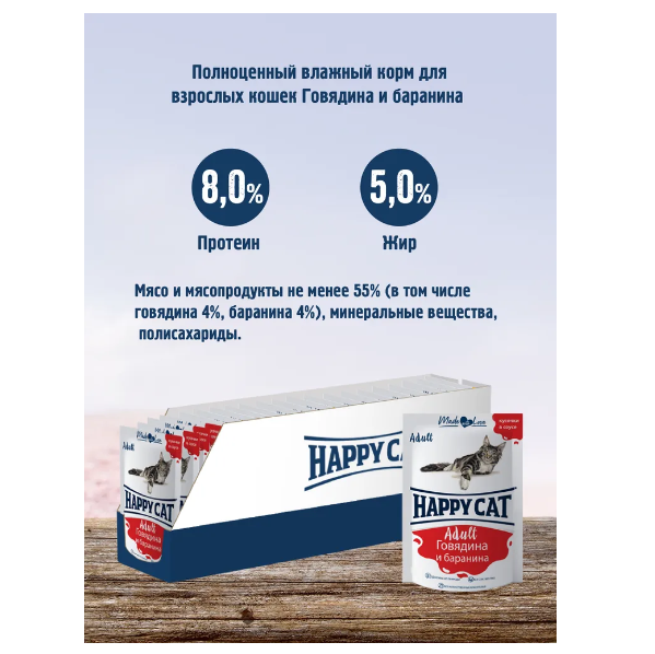 Полноценный корм Happy Cat Говядина и Баранина кусочки в соусе обеспечивает правильное и разнообразное питание кошки. Этот вкусный и натуральный корм содержит качественно отобранные ингредиенты, чтобы порадовать даже самую привередливую кошку. Уникальная технология приготовления позволяет сохранить все ценные свойства натуральных продуктов, чтобы ваш питомец был здоров и полон сил.