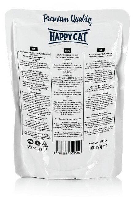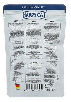 Влажный корм Happy Cat для взрослых кошек кролик/индейка/морковь 100г (1002316)