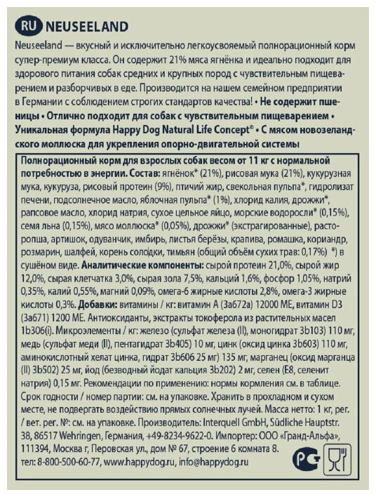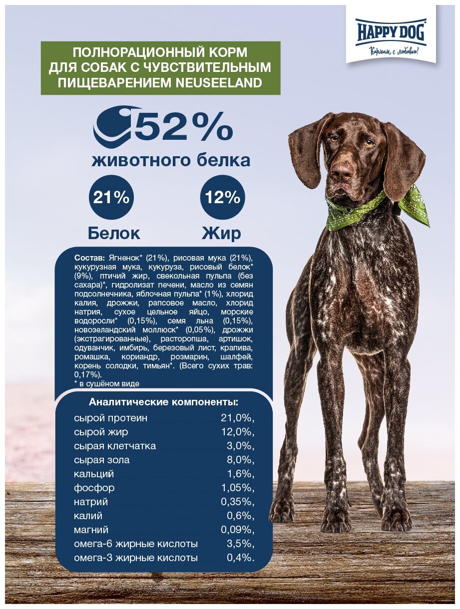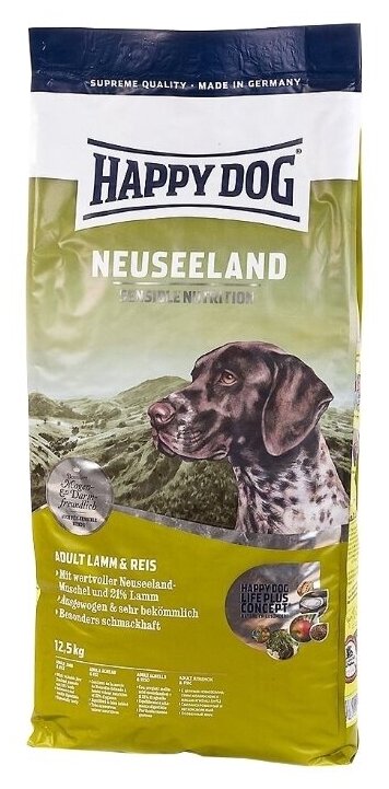 Happy Dog Supreme Neuseeland перебрасывает мост вкуса на противоположную сторону глобуса. Здесь, в условиях нетронутой чистой природы на лугах пасутся овцы, а море приносит дары, такие, как ценный зеленогубый моллюск - лишь один из ингредиентов нашего высококачественного корма для собак. Новая Зеландия славится своей чистой природой, кристальной водой, мясом ягненка с низким содержанием холестерина и особым зеленогубым моллюском. В корме Суприм Новая Зеландия Хэппи дог соединяет воедино 18% ягненка, 9% риса и экстракт зеленогубого моллюск