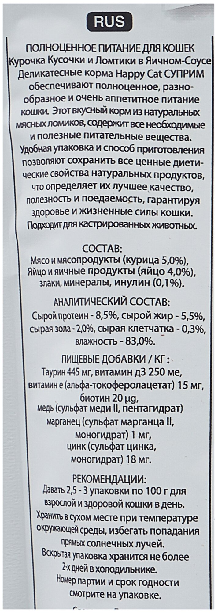 Деликатесный корм Happy Cat курочка кусочки и ломтики в яичном соусе обеспечивает правильное и разнообразное питание кошки. Этот вкусный и натуральный корм содержит качественно отобранные ингредиенты, чтобы порадовать даже самую привередливую кошку. Уникальная технология приготовления позволяет сохранить все ценные свойства натуральных продуктов, чтобы ваш питомец был здоров и полон сил.