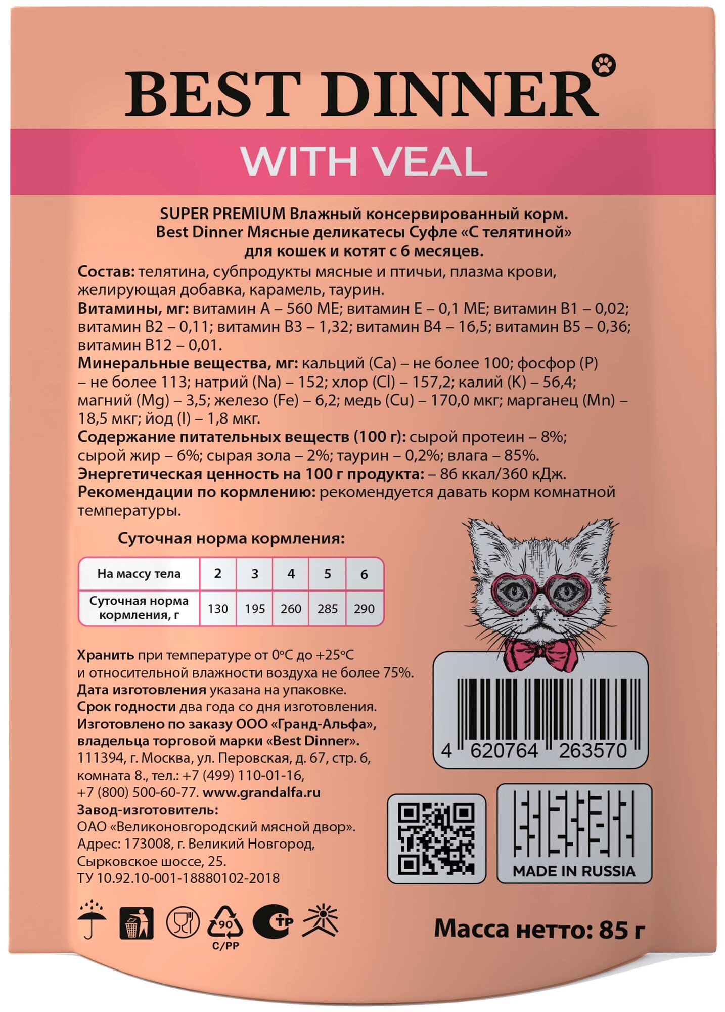 Влажный корм Best Dinner для взрослых кошек телятина 85г (7427)
