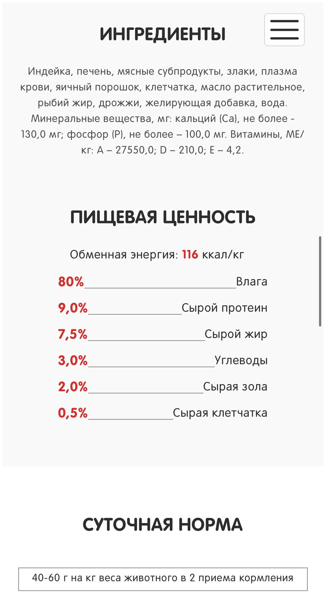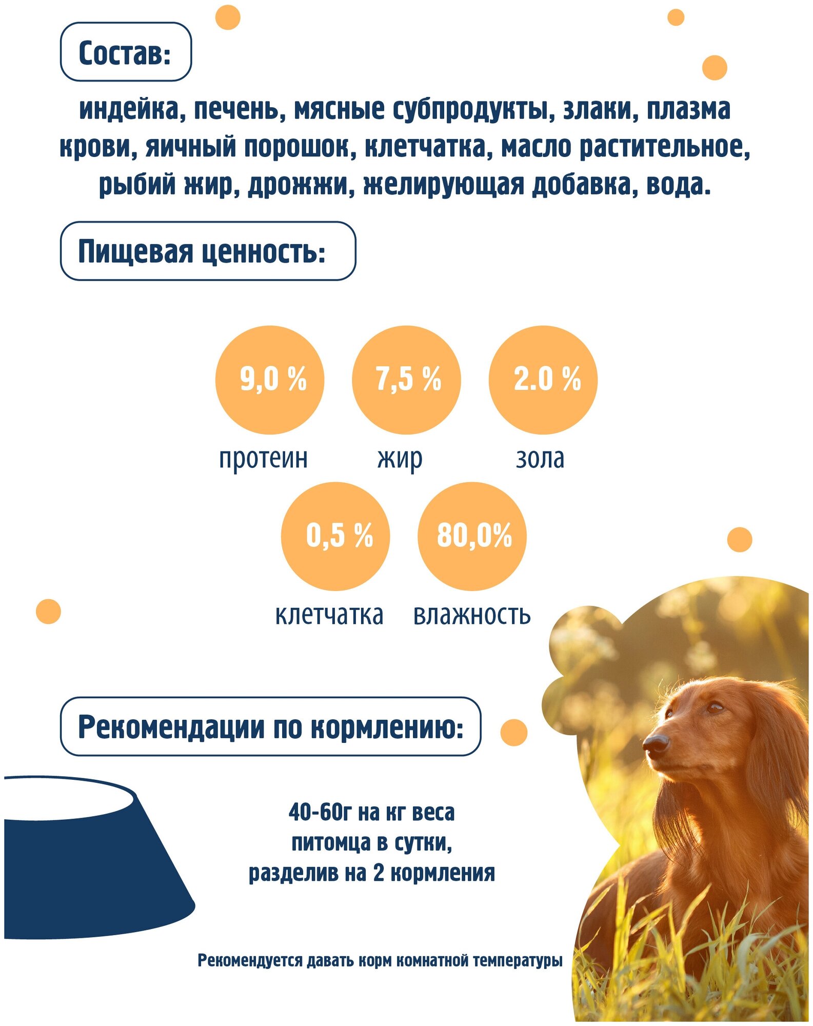 "Сбалансированный натуральный мясной рацион. Изготовлен по оригинальной технологии Interquell GmbH (Германия) из натурального мяса и мясопродуктов. Не содержит сои, искусственных красителей, консервантов и генетически модифицированных организмов.Мясо и мясопродукты (5,0% индейки), минеральные вещества, инулин (0,1%).