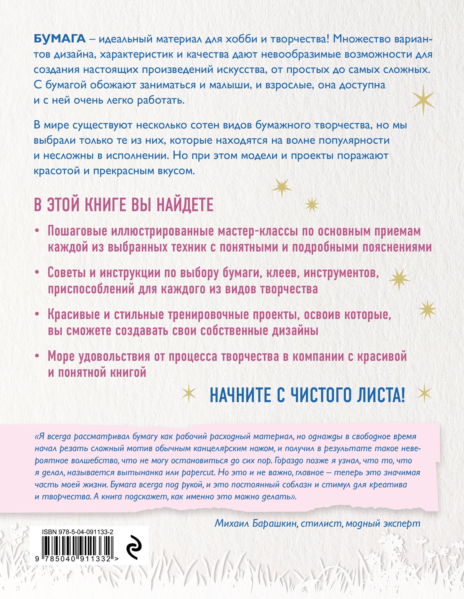 Бумага - самый благодатный материал для творчества. И не только детского. Из бумаги можно создавать настоящие произведения искусства в самых разных техниках! Но как же разобраться в море интересных приемов, многие из которых существуют не одно столетие? Тем более, что каждый год появляются новые и новые виды творчества. Эта книга поможет сориентироваться в наиболее интересных и востребованных видах бумажного искусства, которые на волне популярности именно сейчас. Вечное оригами и изящный квиллинг, волшебная вытынанка (papercut) и самые разные виды современного скрапбукинга, стильная подарочная упаковка и супермодные огромные цветы из бумаги! Вы узнаете как выбрать материалы, какие инструменты нужно приобрести обязательно, а без каких на первых порах можно обойтись, постигнете основы колористики и откроете для себя море новых приемов работы с бумагой, открывающие невероятные декоративные возможности! Огромное количество ярких пошаговых иллюстраций, подробные инструкции и интересные факты, тренировочные проекты и идеальная навигация, авторские советы и подсказки - все это сделает вас настоящими экспертами в бумажном творчестве и, возможно, вы откроете в себе таланты и способности, о которых и не подозревали!
