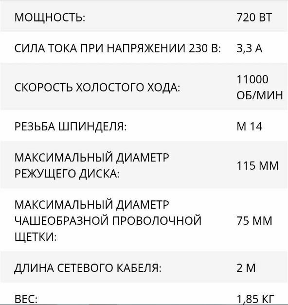| Диаметр диска/шлифкруга | 115 мм (макс. диаметр щетки - 75 мм) |