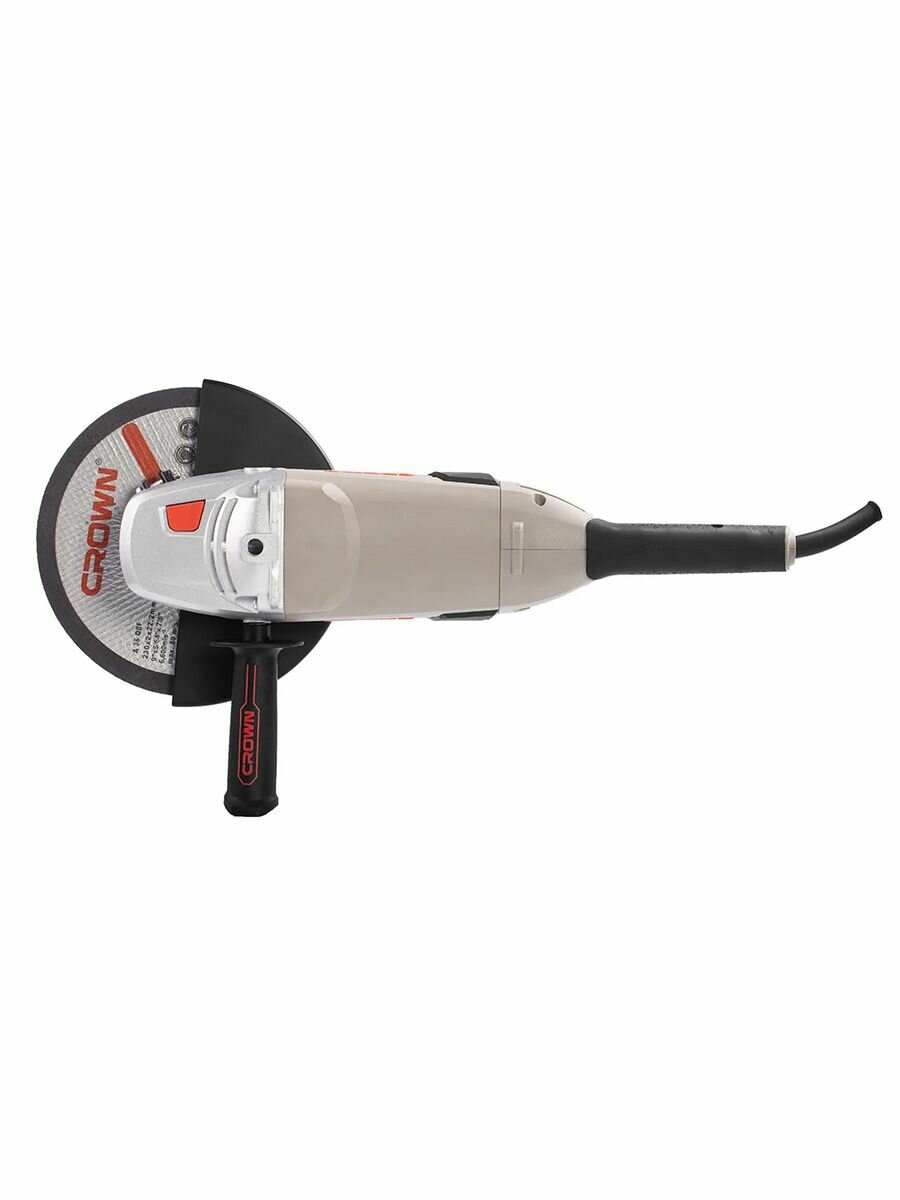 Угловая шлифовальная машина Crown предназначена для распила и шлифовки металлических изделий.Преимущества Плавный пуск предохраняет от резких ударов при включении, обеспечивая продолжительный срок службы инструмента Обрезиненные места хвата снижают нагрузку на кисть оператора Дополнительная рукоятка обеспечивает хороший контроль за инструментом Редукторная часть имеет возможность поворачиваться на 360 позволяя подобрать нужное положение для различных видов деятельности На валу ведомой шестерни напрессован шариковый подшипник, а косозубое соединение углового редуктора снижает вибрацию и шум инструмента Двигатель за счёт больших вентиляционных отверстий позволяет работать УШМ длительное время не перегревая обмотки