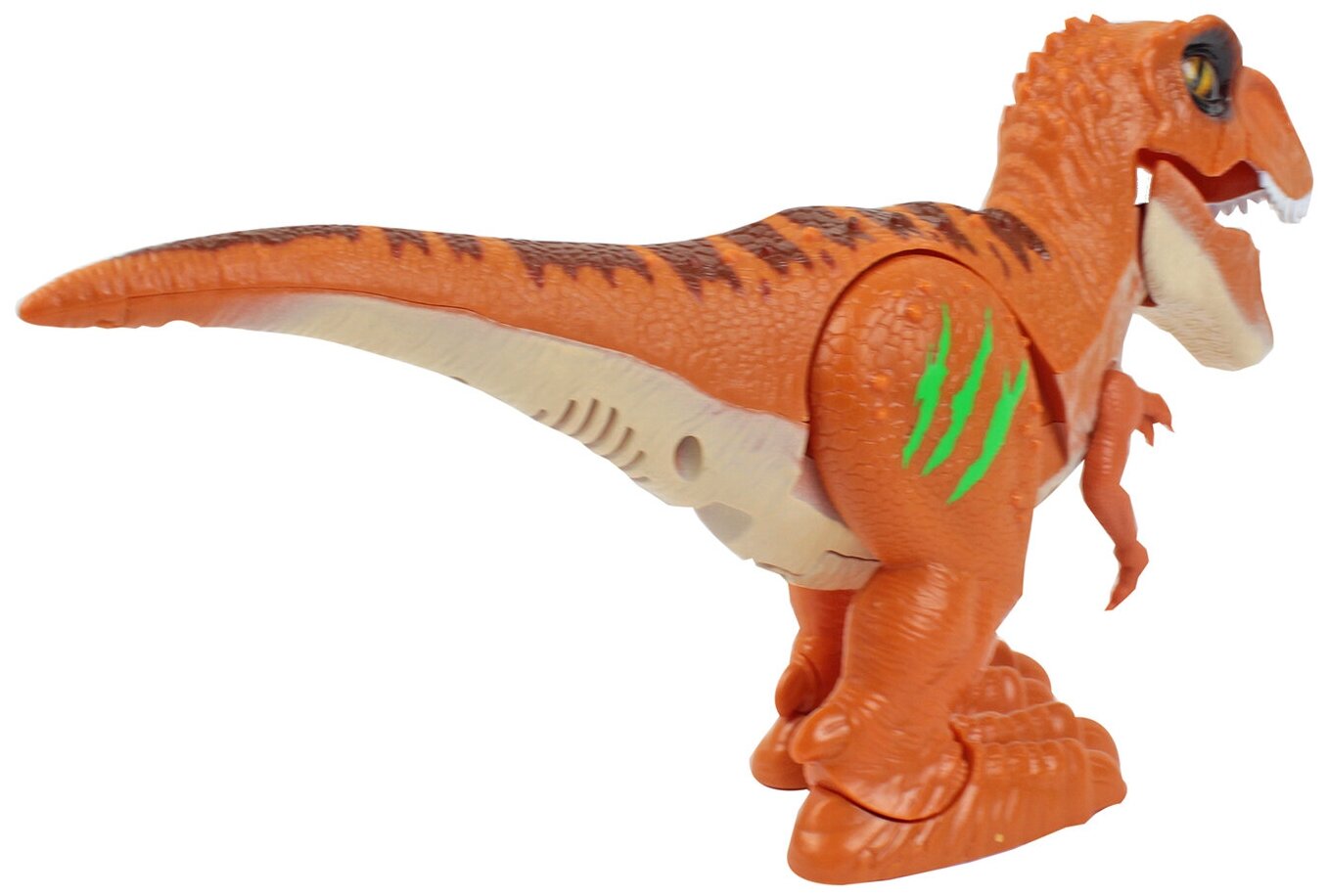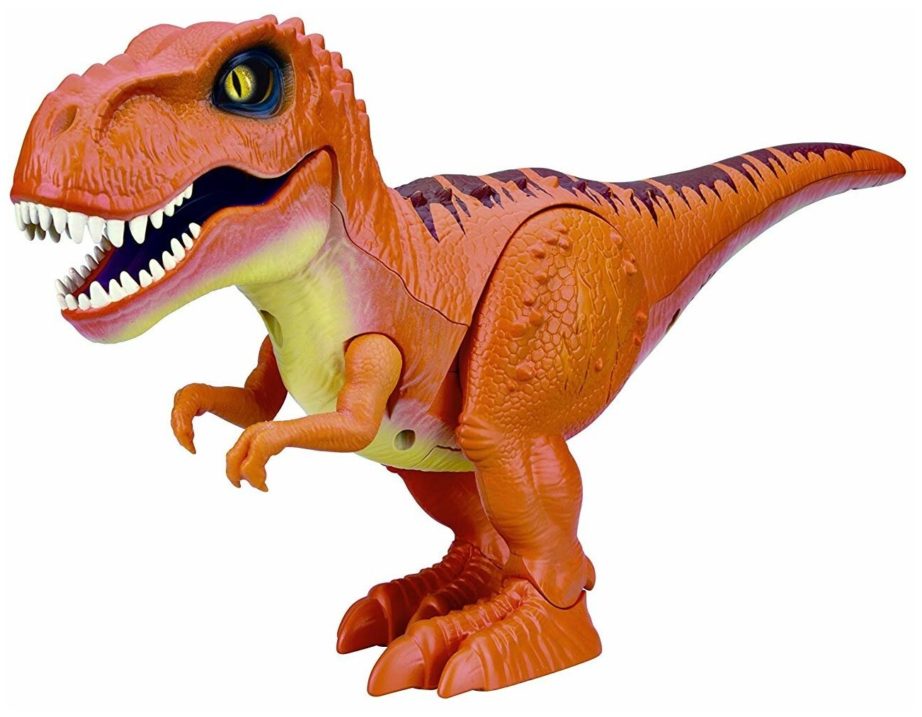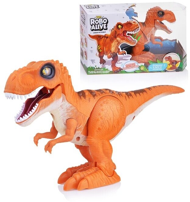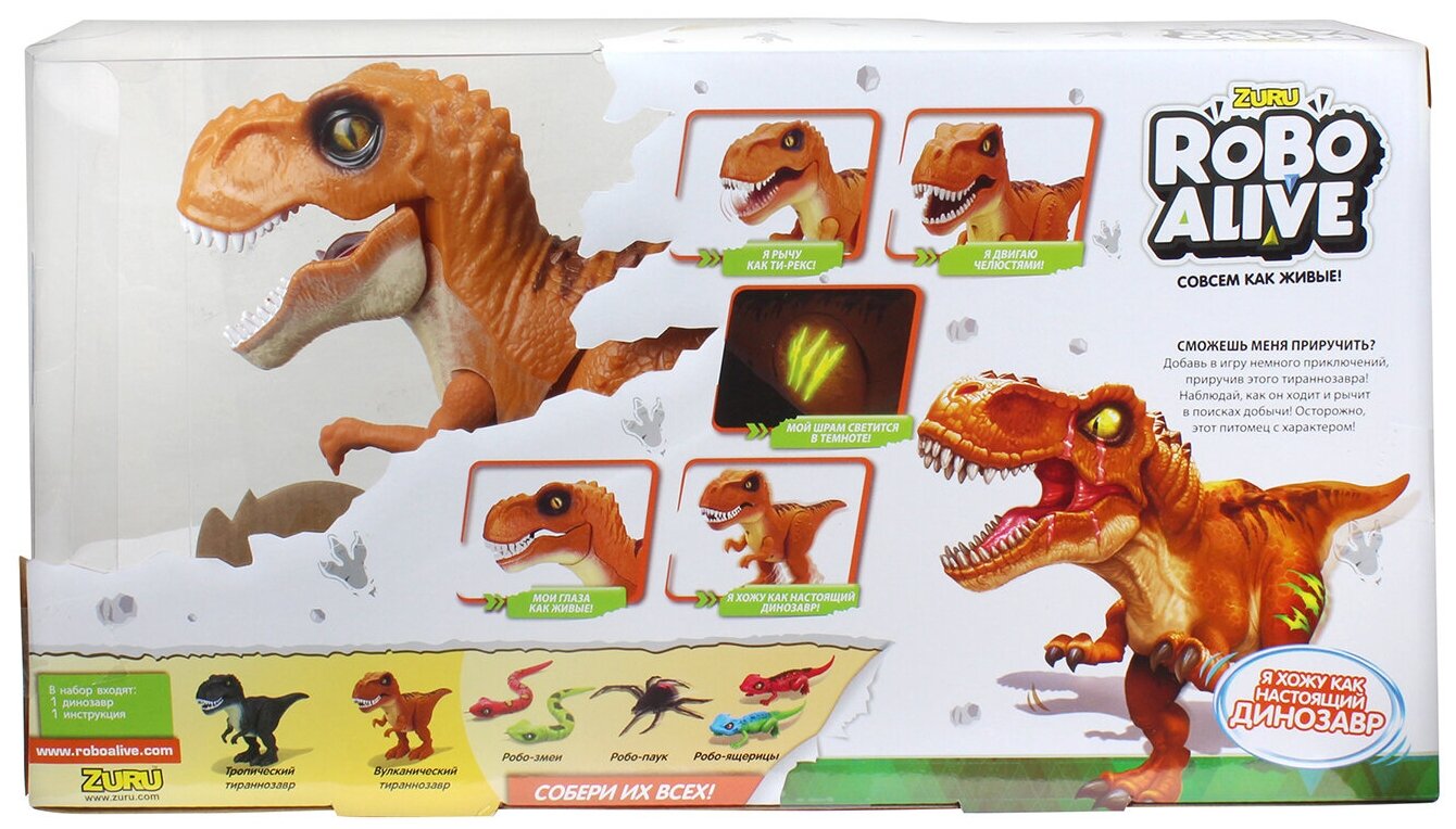 Роботизированная технология позволяет грозному динозавру Тираннозавру T-REX преспокойно пастись по просторам детской комнаты. В движении динозавр Зуру уверенно двигает своими мощными лапами, раскрывает и закрывает огромную пасть, сверкает глазами и громко рычит. Отдельные участки шкуры динозавра могут светиться в темноте. Для того, чтобы атакующему тираннозавру начать двигаться, в него необходимо вставить батарейки, включить переключатель и выпустить на пол. Если Вам захочется остановить динозавра - просто возьмите его на руки. Динозавр T-REX RoboAlive ZURU изготовлен из мягкой резины. Особенности:ходит как настоящий динозавр;клацает челюстями;рычит и "кусается";детализированные, отражающие свет глаза;участки туловища светятся в темноте.Характеристики:Возраст: от 3 летМатериал: Пластмасса с элементами из металла и резины.Работает от 2х батареек 1,5V типа ААА (не входят в комплект)