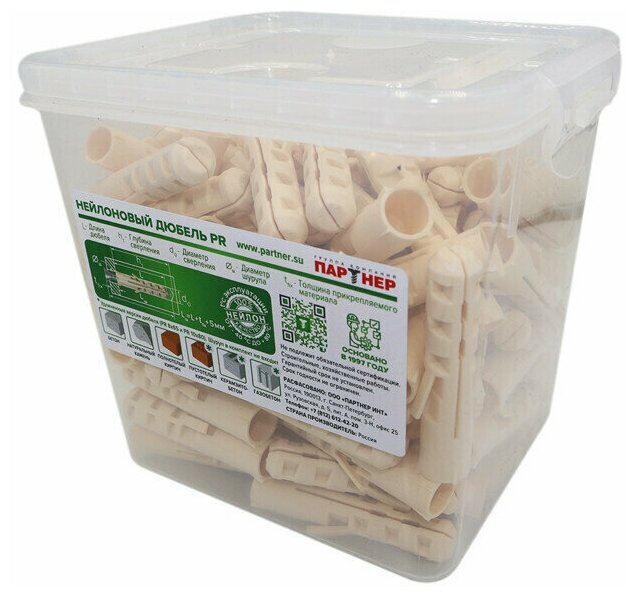 Нейлоновые дюбели партнер PR предназначены для крепления легких конструкций к твердым материалам основания: бетон, натуральный камень, полнотелый кирпич.В качестве распорного элемента рекомендуется применение универсальных или сантехнических шурупов. Длина подходящего шурупа определяется как: длина дюбеля + толщина прикрепляемого материала + 5 мм.Дюбели изготавливаются из полиамида PA6 Ultramid производства компании BASF в светло-бежевом цвете.