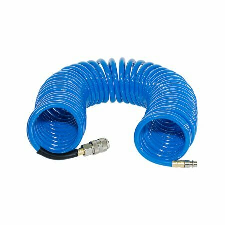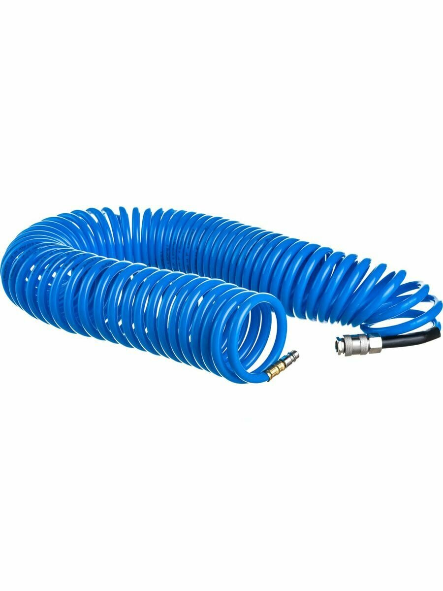 Данная модель представляет собой спиральный шланг для соединения компрессора и пневмоинструмента. Шланг предназначен для подведения сжатого воздуха к пневматическому инструменту, подключения пневматического оборудования, а также для проведения воздушных магистралей к рабочим местам. Изделие изготовлено из полиуретана. Соединение - фитинги рапид.