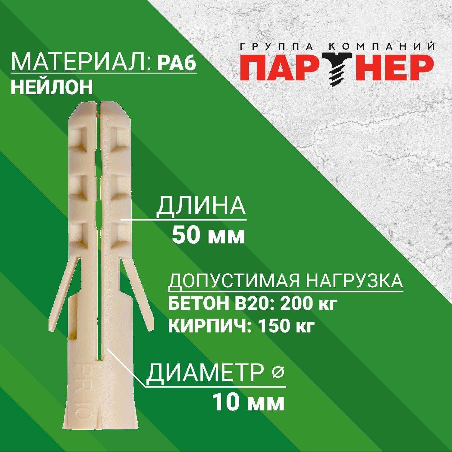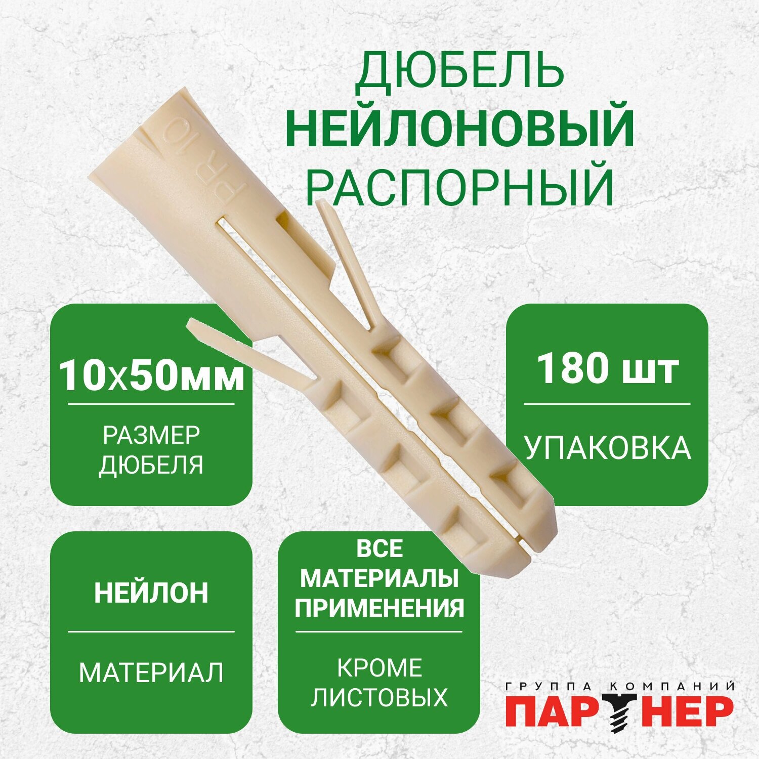 Нейлоновый дюбель Партнер PR 10x50 180 шт 827080 предназначен для крепления легких конструкций к твердым материалам основания: бетон, натуральный камень, полнотелый кирпич. В качестве распорного элемента рекомендуется применение универсальных или сантехнических шурупов. Длина подходящего шурупа определяется как: длина дюбеля + толщина прикрепляемого материала + 5 мм. Дюбели изготавливаются из полиамида PA6 Ultramid производства компании BASF в светло-бежевом цвете.