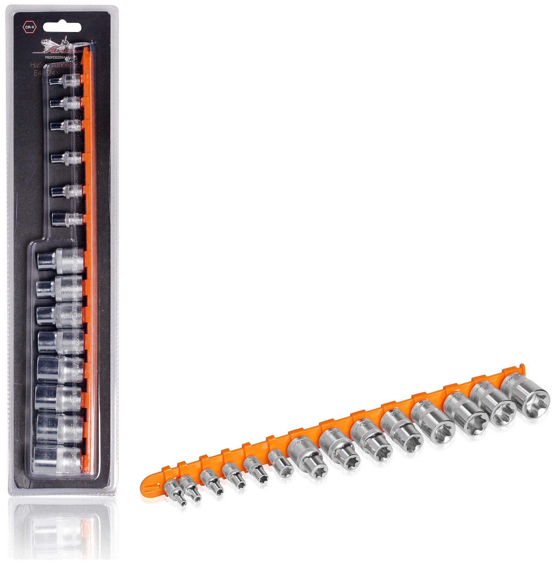 | Головка 1/4"DR (по 1 шт.) | Е4,Е5,Е6,Е7,E8,Е10 Головка 1/2"DR (по 1 шт.): Е11,Е12,Е14,Е16,Е18,E20,E22,E24 |