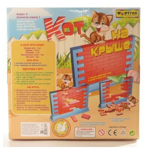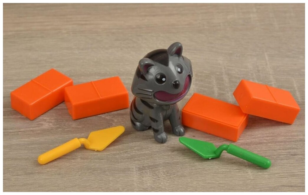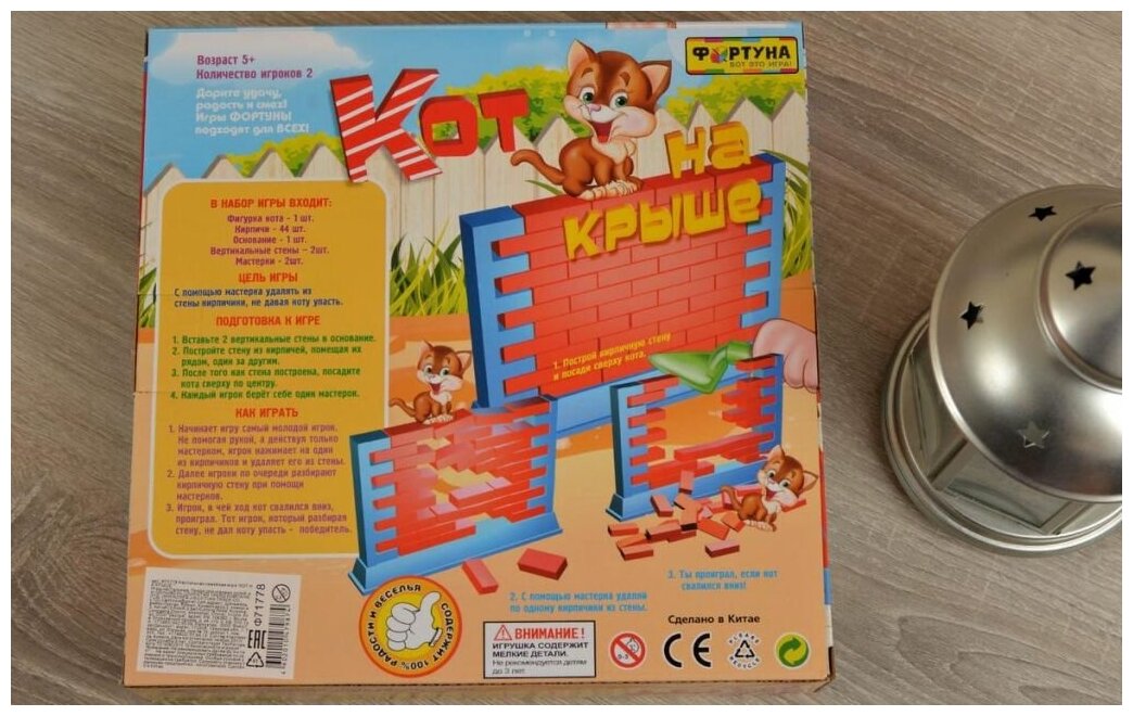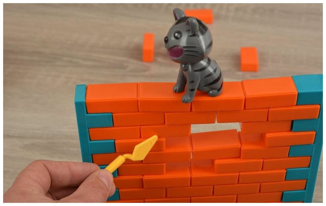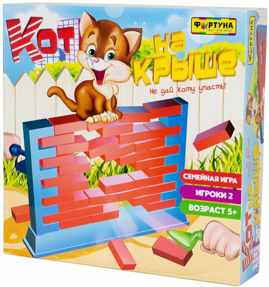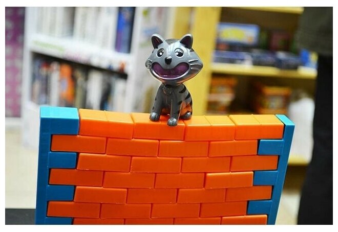 Как играть? Перед началом игры все кирпичики вставляются в основу так, чтобы получилась ровная стена. На верхний край посередине сажается пластмассовый котик. После этого каждый игрок по очереди должен вытащить один кирпич из стены так, чтобы верхний край удержался, и котик не упал. Для аккуратного вытаскивания кирпичей используются маленькие мастерки. Тот, в чей ход верхняя часть стены обвалилась и кот упал, считается проигравшим. В качестве расплаты он строит новую стену — ведь всем, наверняка, захочется сыграть еще разочек. Кому подойдет эта игра? В эту игру влюбляются все дети старше четырех лет и их родители. Судите сами: Кот на крыше — это яркие детали, простые правила и, конечно, главный герой — котик, за судьбу которого переживают все игроки. Родители довольны, потому что игра развивает мелкую моторику, а малышам нравится экспериментировать с тем, как по-разному можно вытащить кирпичи.