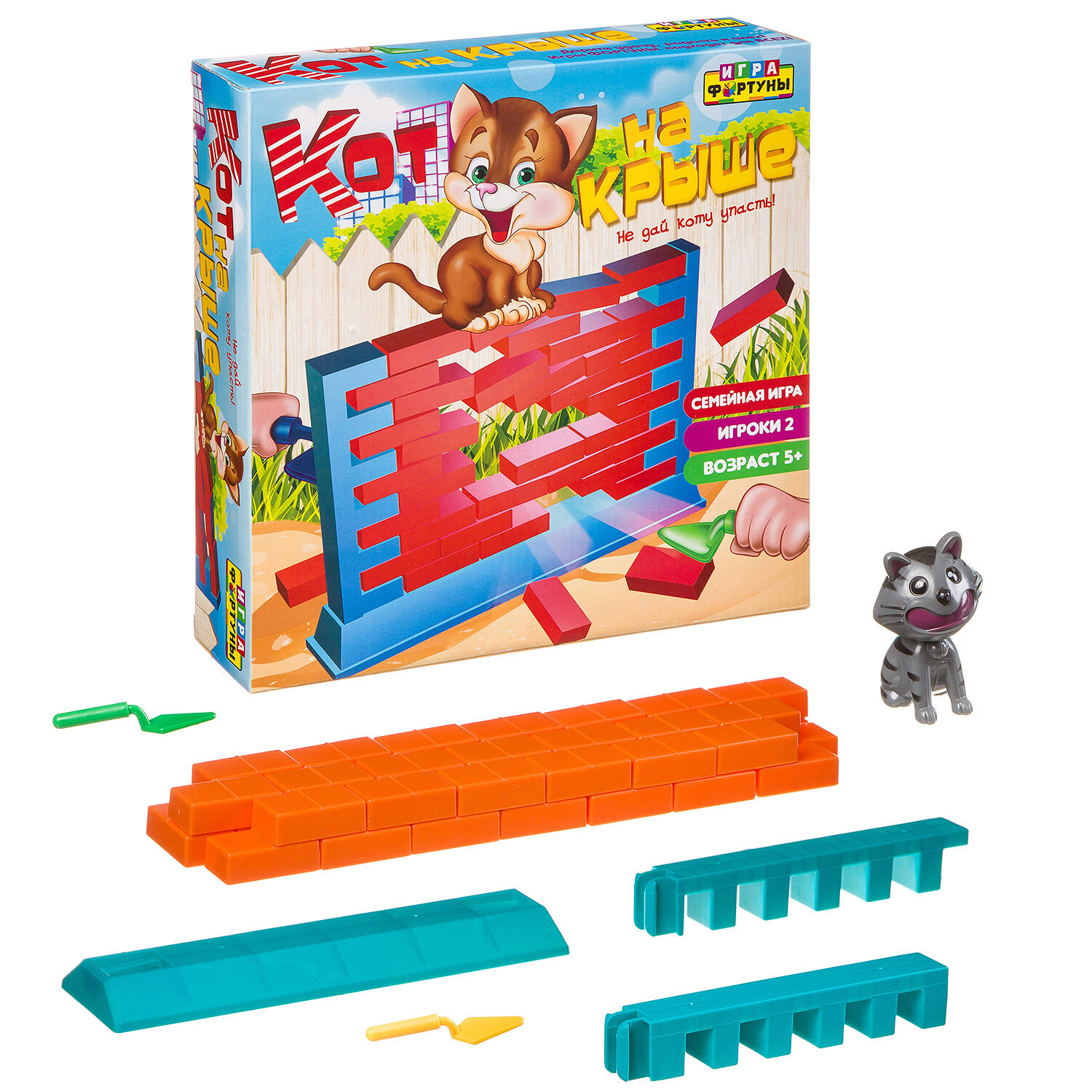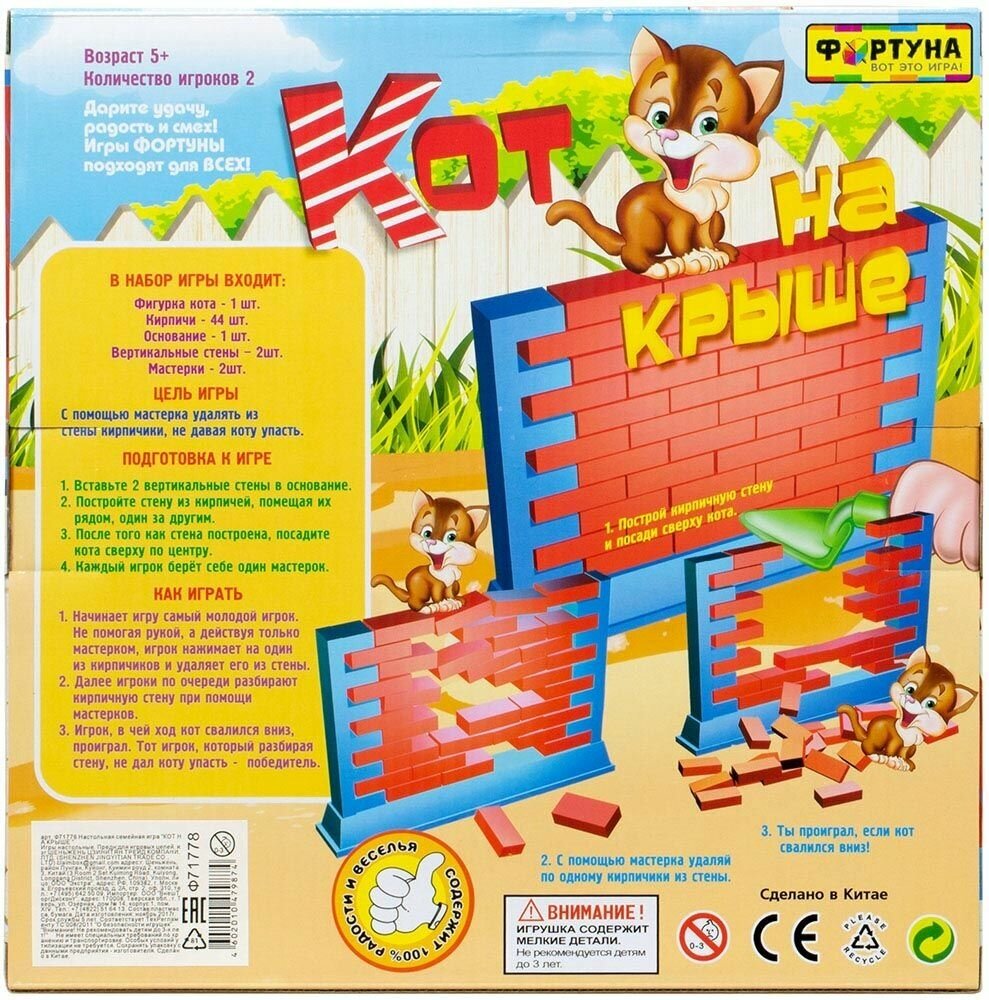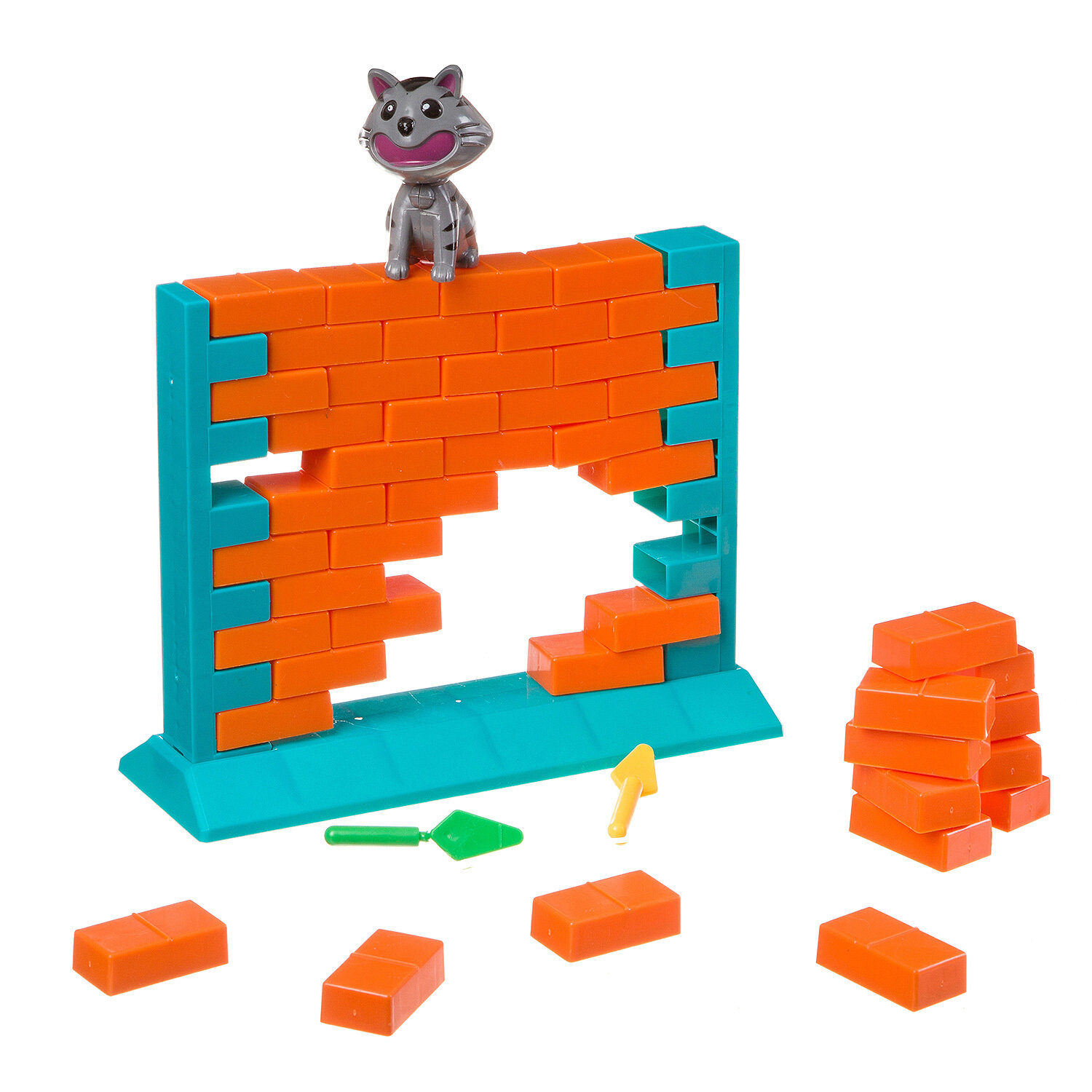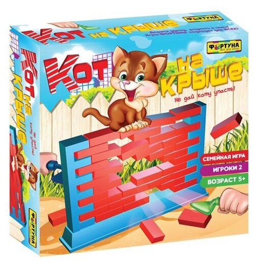 Как играть? Перед началом игры все кирпичики вставляются в основу так, чтобы получилась ровная стена. На верхний край посередине сажается пластмассовый котик. После этого каждый игрок по очереди должен вытащить один кирпич из стены так, чтобы верхний край удержался, и котик не упал. Для аккуратного вытаскивания кирпичей используются маленькие мастерки. Тот, в чей ход верхняя часть стены обвалилась и кот упал, считается проигравшим. В качестве расплаты он строит новую стену — ведь всем, наверняка, захочется сыграть еще разочек. Кому подойдет эта игра? В эту игру влюбляются все дети старше четырех лет и их родители. Судите сами: Кот на крыше — это яркие детали, простые правила и, конечно, главный герой — котик, за судьбу которого переживают все игроки. Родители довольны, потому что игра развивает мелкую моторику, а малышам нравится экспериментировать с тем, как по-разному можно вытащить кирпичи.