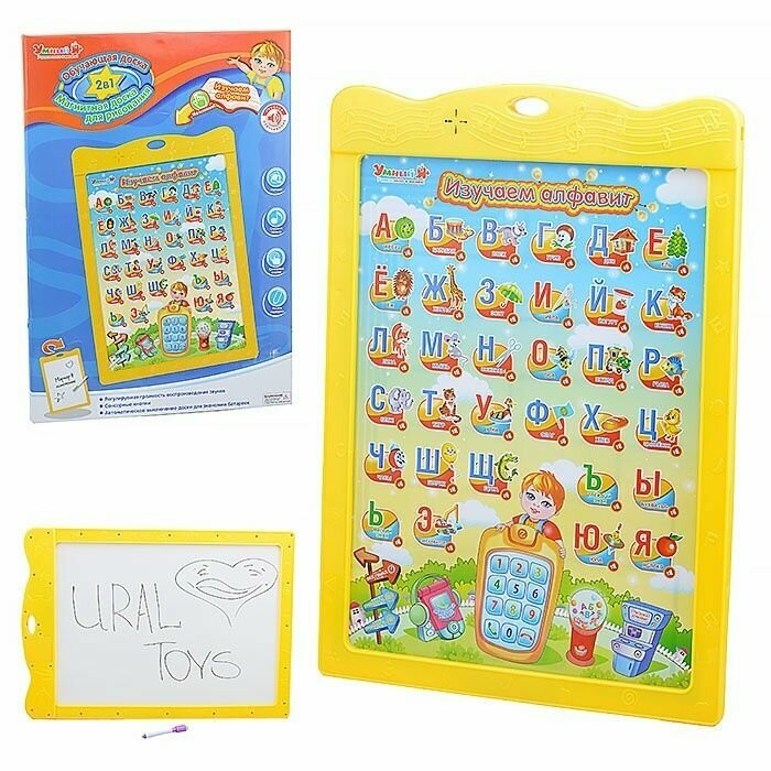У обучающей доски сенсорные кнопочки. Она работает в двух режимах. В режиме «Давай учиться» ребенок сможет изучать буквы, слова и стихи, а также пройти экзамен на поиск буквы или слова. В режиме «Телефончик» ребенок будет учить цифры и забавные фразы. Кроме того, при помощи кнопочек можно включить веселую песенку. Присутствует возможность регулировки громкости звуков, а после длительной паузы в использовании срабатывает автовыключение. С другой стороны обучающей доски есть магнитная часть на которой ребенок сможет рисовать при помощи маркера, который входит в набор.