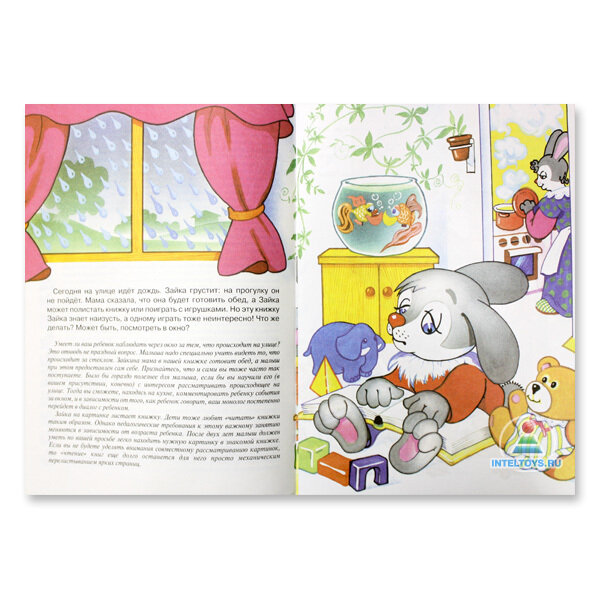 Курсивом внизу страниц (первой, третьей и последней) даны наставления родителям, а в начале книжки целый разворот.