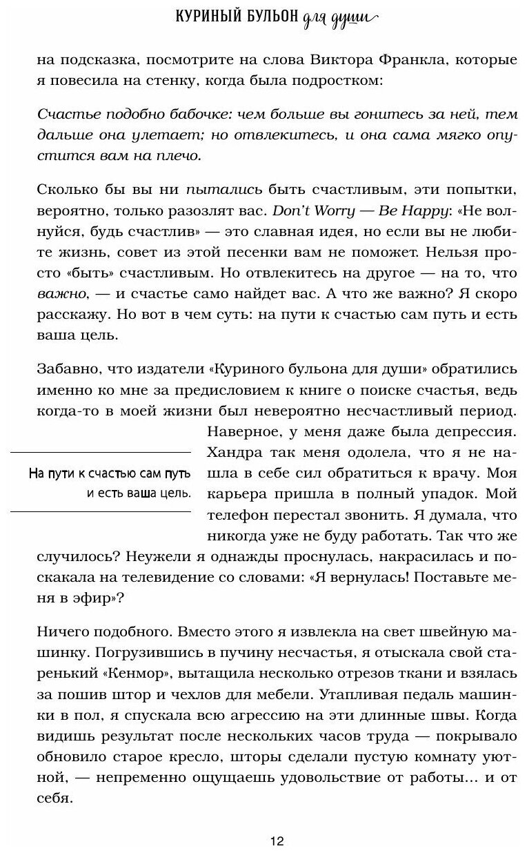 В попытках найти рецепт счастья мы часто оказываемся разочарованы. В этом сборнике "Куриного бульона для души" истории специально подобраны так, чтобы показать: к счастью ведет множество дорог. Одни герои подарят вам надежду. Другие заставят улыбнуться и обратить внимание на то хорошее, что уже есть в вашей жизни. А две-три истории из сборника станут для вас настоящим вдохновением и путеводной звездой.