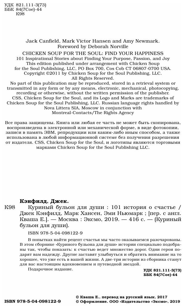 Куриный бульон для души: 101 история о счастье (Кэнфилд Джек , Ньюмарк Эми (соавтор), Хансен Марк Виктор (соавтор), Кваша Е.А. (переводчик)); Эксмо, 2019