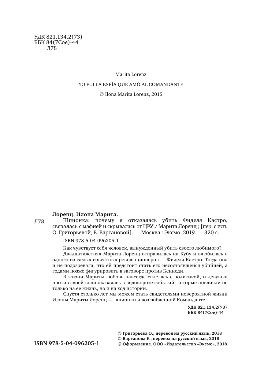 Шпионка. Почему я отказалась убить Фиделя Кастро связалась с мафией и скрывалась от ЦРУ (Лоренц Марита, Григорьева О. (переводчик), Вартанова Е. (переводчик)); Эксмо, 2019