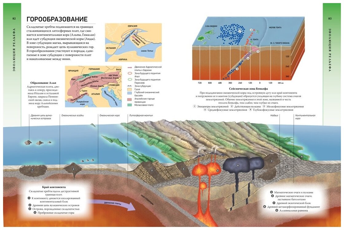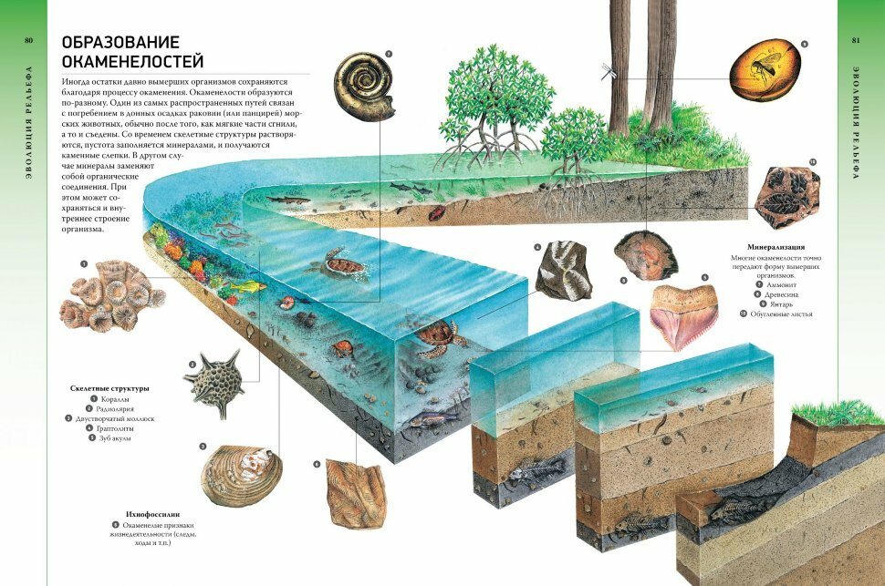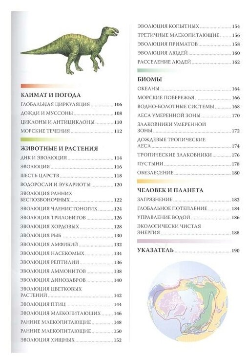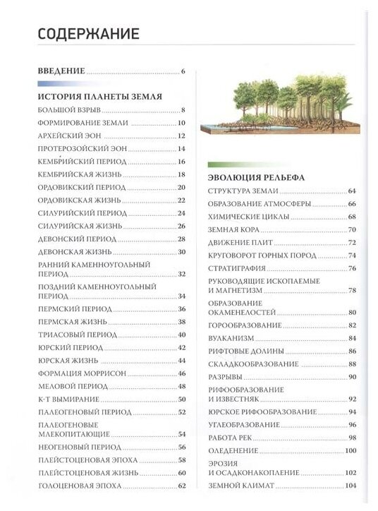 Эта книга состоит из 6 тематических разделов. Сначала рассмотрена геологическая история Земли с хронологией важнейших для каждого периода событий, с иллюстрациями, показывающими значимые местообитания и жизненные формы, с картами континентов и океанов. Затем идет раздел, посвященный геологическим процессам. Рисунки и карты в нем помогают понять силы, формирующие облик нашей планеты. За ним следуют разделы, рассказывающие о климате и погоде, животных и растениях (в том числе об эволюции некоторых их групп), основных биомах. Наконец, рассматриваются основные экологические проблемы современности, в частности глобальное потепление. Включающая более 1000 рисунков, эта книга действительно является прекрасным иллюстрированным путеводителем по истории планеты Земля.