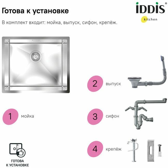 Кухонная мойка .Кухонная мойка Iddis имеет удобную форму и современный дизайн. Мойка изготовлена из нержавеющей стали, которая гарантирует мойке прочность и стойкость к механическим воздействиям.Габариты(ШxД): 440x540 см.В комплекте поставки: кухонная мойка, сифон, выпуск, клапан-автомат, крепления, шаблон выреза, инструкция.