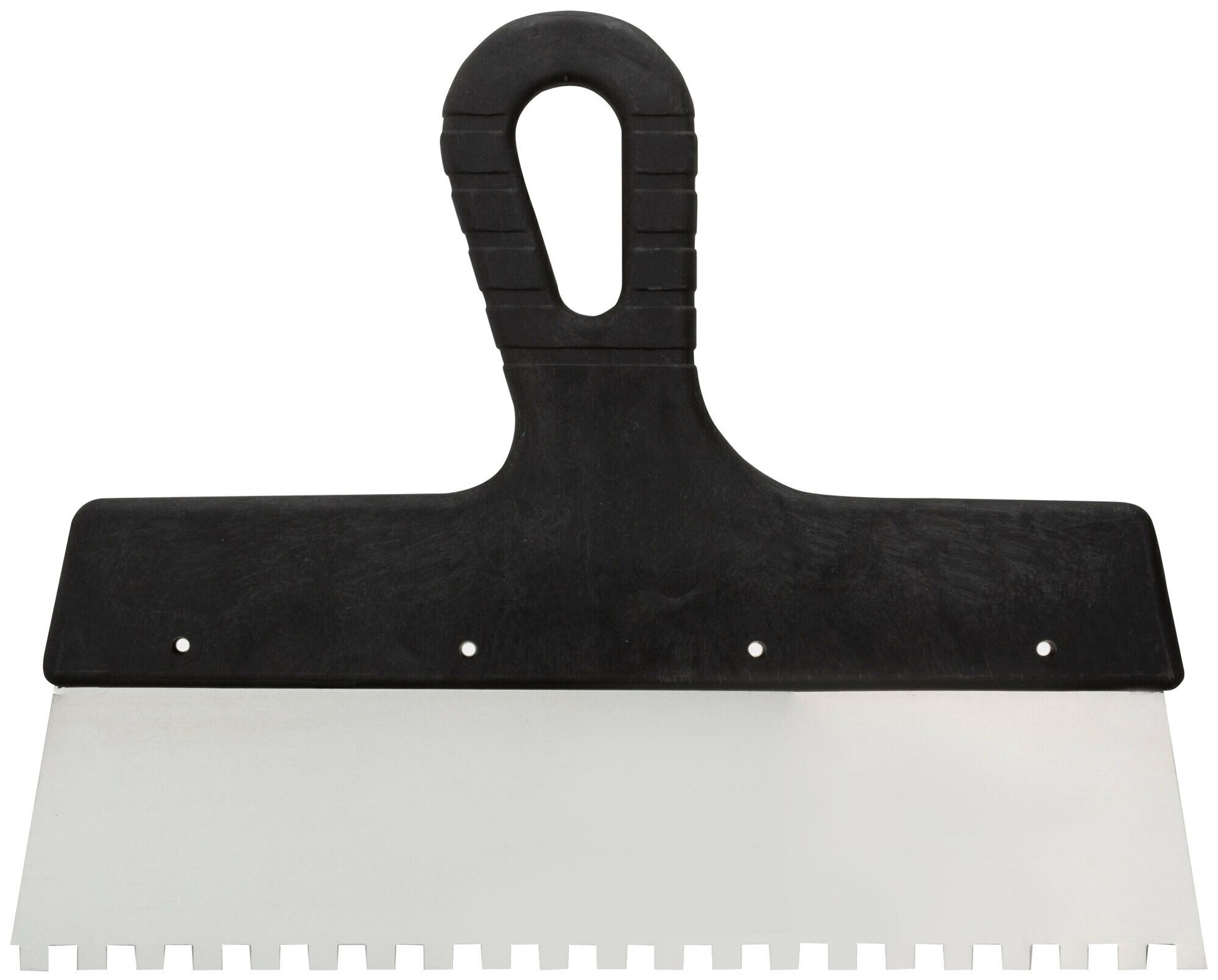 Шпатель зубчатый. Для нанесения клея. Материал:нержавеющая сталь, пластиковая ручка.