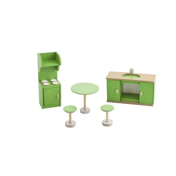 - Игрушки выполнены в виде: круглого кукольного стола зеленого цвета, на одной ножке с 4 табуретками, мойкой с раковиной и краном, кухонной тумбой и белым холодильником.