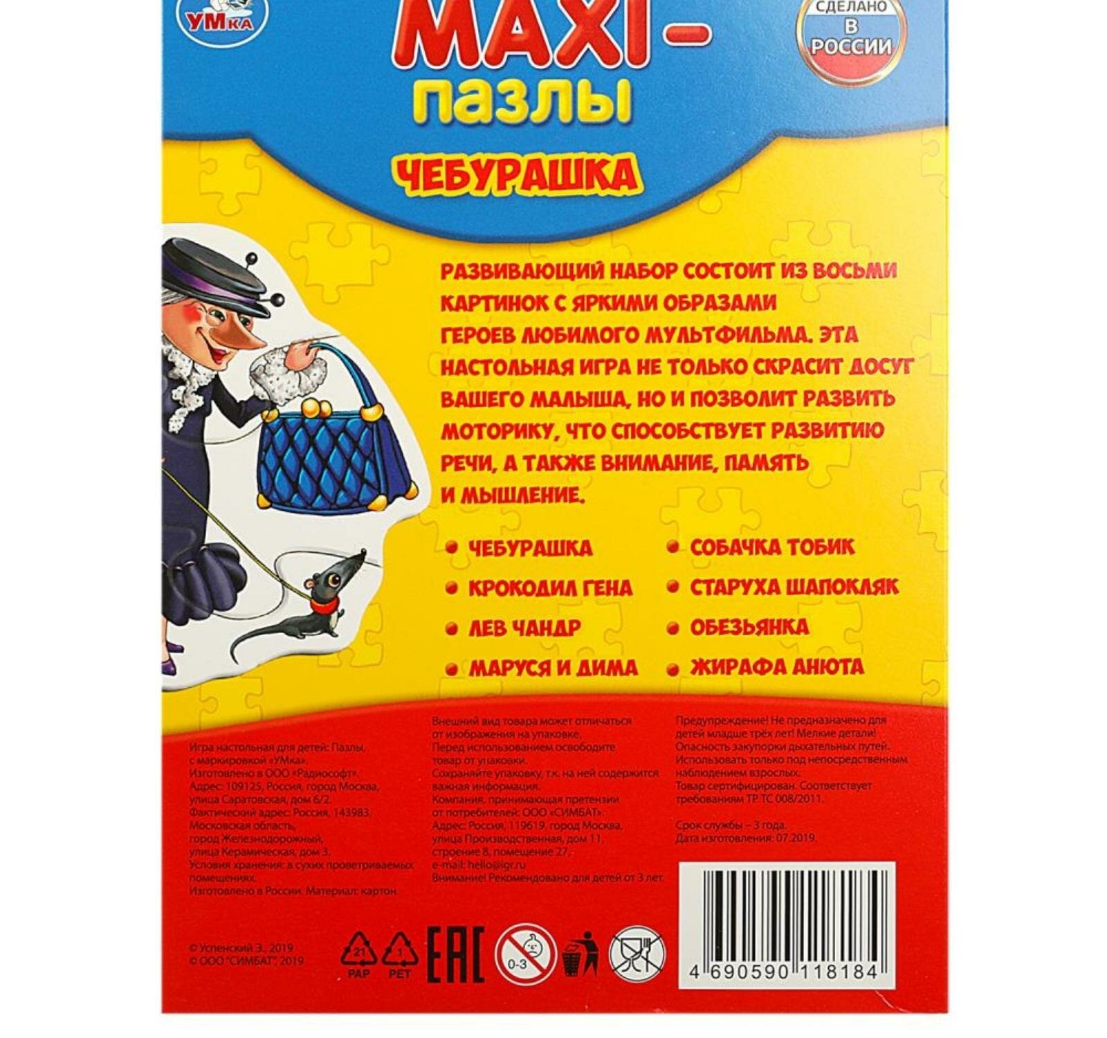 Если вы хотите, чтобы Ваш ребёнок, играя, еще и одновременно развивался, то стоит обратить внимание на такой вид детского досуга как сборка пазлов. Ведь соединяя отдельные детали кроха будет улучшать многие полезные навыки, например, мелкую моторику рук или пространственное мышление. В комплекте Макси-пазла Чебурашка представлено 8 развивающих картинок. В процессе игры дети смогут развить логическое и пространственное мышление, а также научатся различать цвета. Набор выполнен из безопасных для детей прочных материалов, высокого качества и нетоксичных. Элементы пазла окрашены яркими устойчивыми красителями. Материал: картон. Рекомендовано детям от 2-х лет.