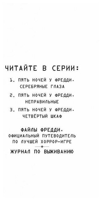 Книга - настоящий фанатский продукт, и при этом качественный, ведь её автор- сам Скотт Коутон, создатель FNAF ("Пять ночей с Фредди"). Эта история раскрывает все те загадки, которые остались "за кадром" франшизы.