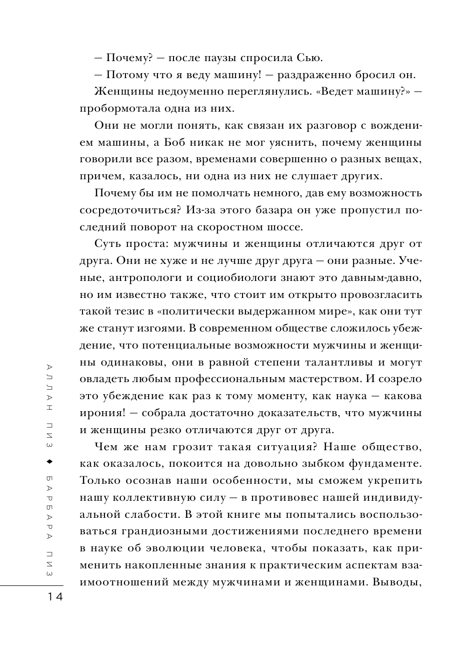 Мужчины и женщины с давних времен пытаются понять друг друга. Аллан и Барбара Пиз, всемирно известные психологи и счастливые супруги, учат читать представителей противоположного пола как открытую книгу. Они объясняют, почему мужчины не обращают внимания на детали, а женщинам так важны прикосновения. Рассказывают, как побудить мужчину к действию, а женщину - заставить замолчать. Помогают понять, из-за чего партнеры не уживаются друг с другом.