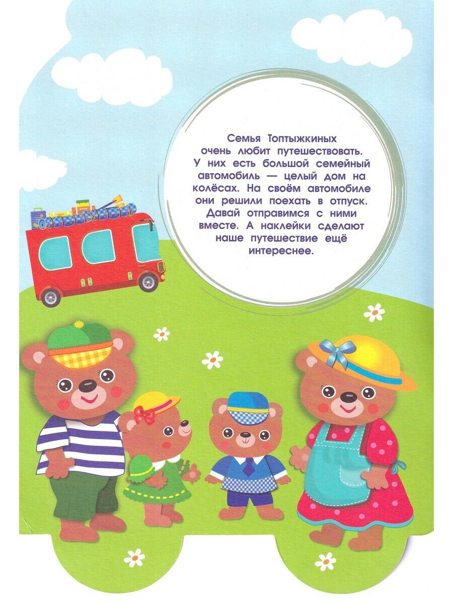 Семья Топтыжкиных очень любит путешествовать. У них есть большой семейный автомобиль - целый дом на колесах. На своем автомобиле они решили поехать в отпуск. Давай отправимся с ними вместе. А наклейки сделают наше путешествие еще интереснее.
