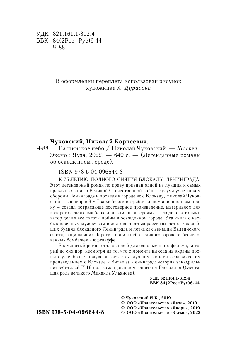 К 75-летию полного снятия блокады Ленинграда. Этот легендарный роман по праву признан одной из лучших и самых правдивых книг о Великой Отечественной войне. Будучи участником обороны Ленинграда и проведя в городе всю Блокаду Николай Чуковский - военкор в 3-м Гвардейском истребительном авиационном полку - создал потрясающе достоверное произведение материалом для которого стала сама блокадная жизнь, а героями люди, с которыми автор делил все тяготы войны в осажденном городе. Эта книга с необыкновенным мужеством и достоверностью рассказывает о тяжелейших буднях блокадного Ленинграда и летчиках авиации Балтийского флота, защищавших Дорогу жизни и небо великого города от бесчеловечных бомбежек Люфтваффе.