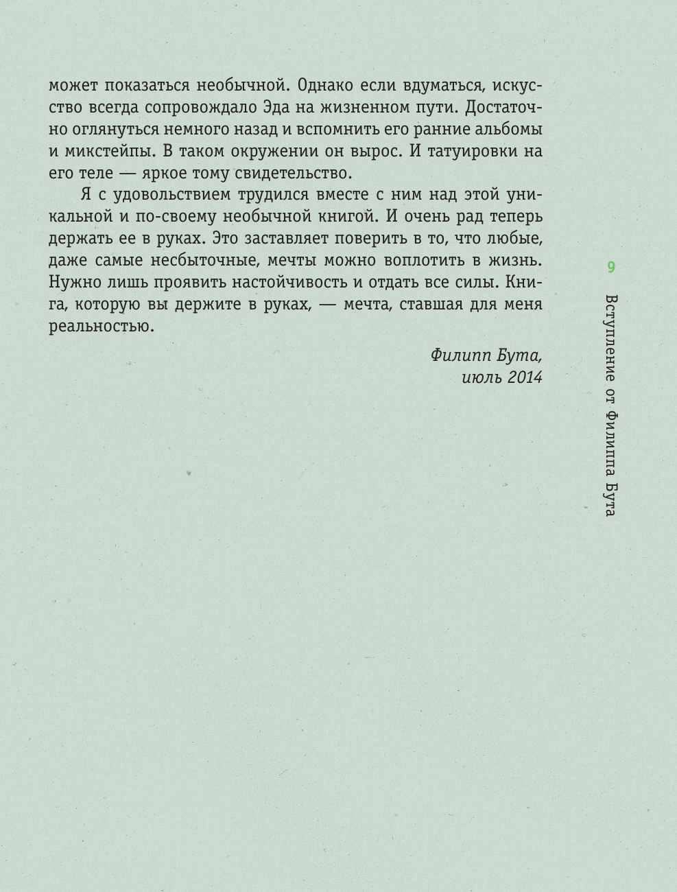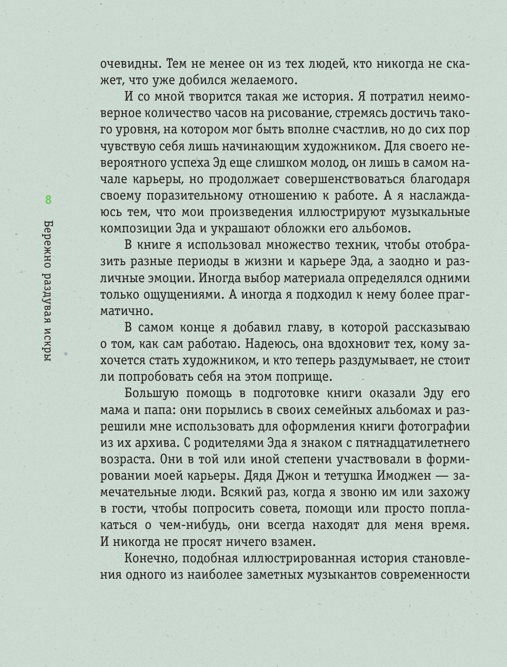 Если Вам интересно становление и путь Эда, то эта книга должна Вам понравится. Все подробно описано, куча примеров, историй рассказанные самим певцом. Все это подкреплено фотографиями и потрясающими работами художника (по-совместительству хорошего друга Ширина).