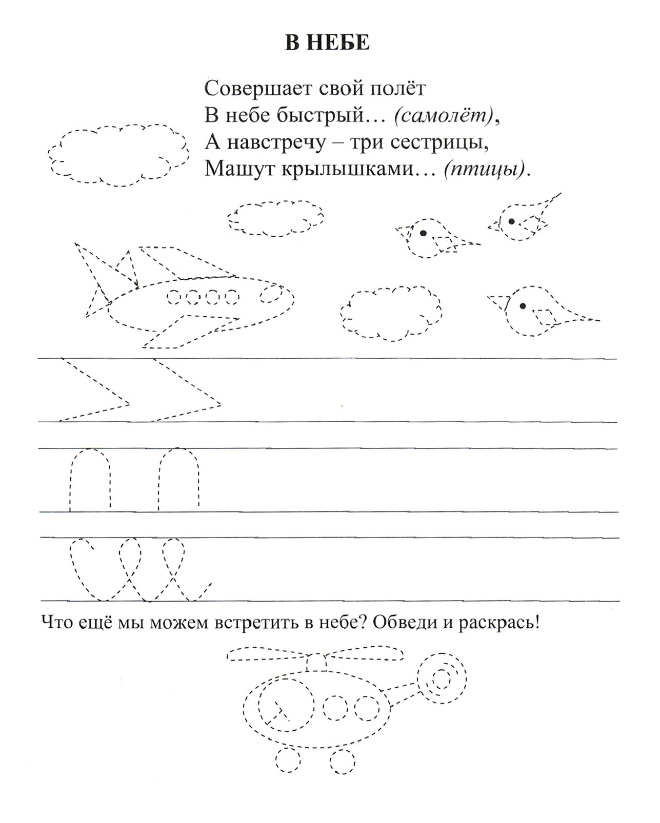 Внутри имеются задания на повторение узоров, в линеечку. Задание на то чтобы просто обвести рисунок по контуру. А ещё очень сильно порадовало наличие коротеньких стихотворений, в которых ребенок самостоятельно должен сказать продолжение -