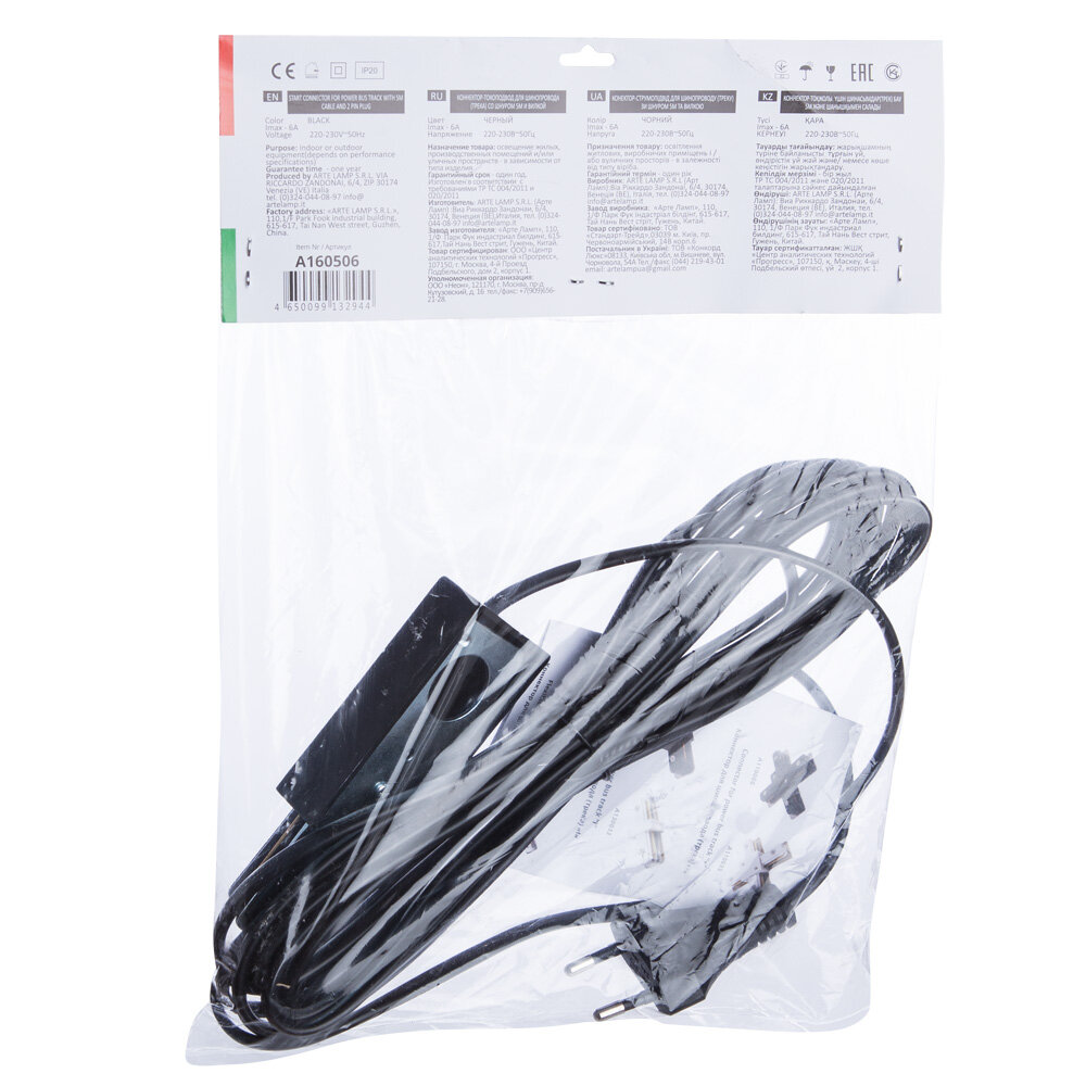 Светильник Artelamp A160506 серии Track accessories. Подчеркнет стиль помещения. Длина 5.1 m. Параметры пылевлагозащиты IP — 20. Материал/цвет арматуры пластик/черный. Страна происхождения бренда — Италия.