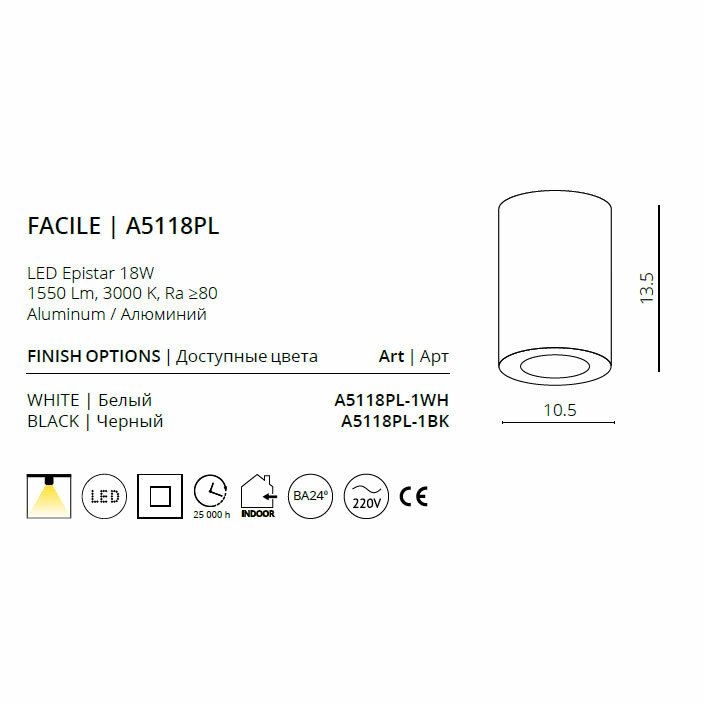 Точечный светильник Facile LED A5118PL-1BK - продукт известной компании Artelamp (Италия). Имеет максимальную мощность 18 Вт, освещает площадь до 4 кв. м. Отлично подойдет для таких мест, как гостиная, прихожая и коридор, кафе, кухня, офис, магазин. Впишется в интерьеры следующих стилей: хай-тек.
