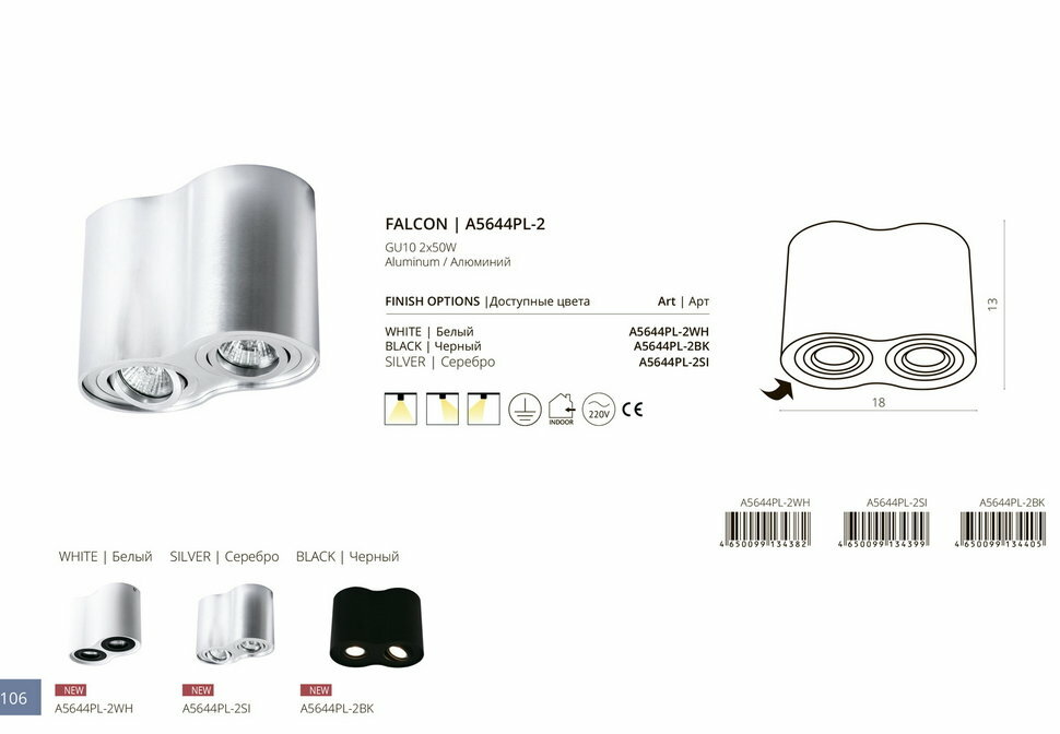 Точечный светильник A5644PL-2SI - продукт известной компании Artelamp (Италия). Имеет максимальную мощность 100 Вт, освещает площадь до 2 кв. м. Отлично подойдет для таких мест, как гостиная, прихожая и коридор, кафе, кухня, офис, магазин. Впишется в интерьеры следующих стилей: техно.