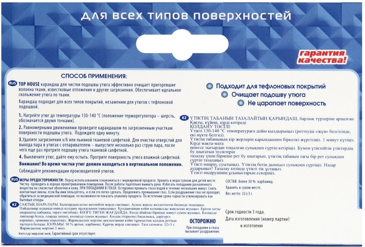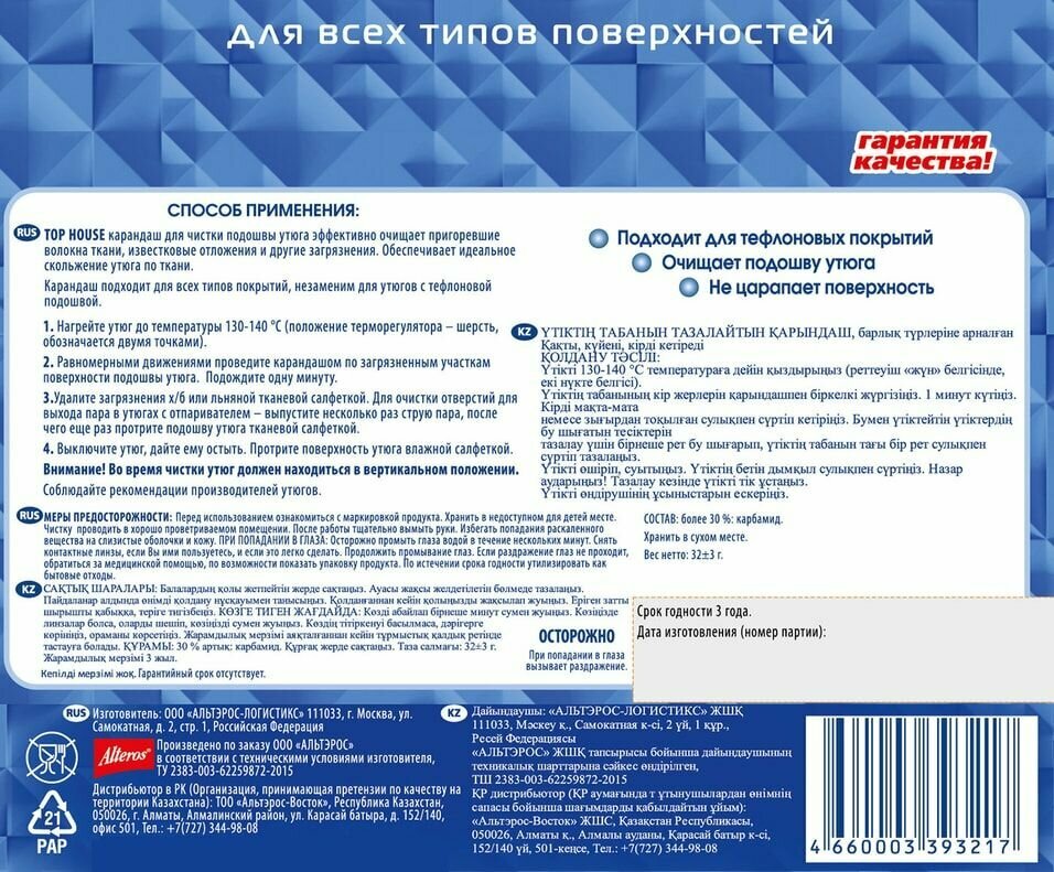 Карандаш Top House для чистки подошвы утюга 32 г 393217