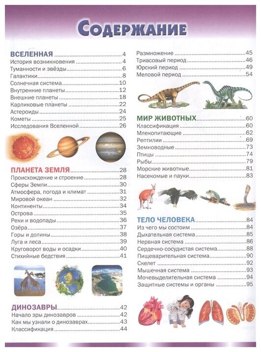 Прикольная энциклопедия для совсем маленьких деток. По возрасту подойдет примерно от 4-5 –х лет. Но стоит сразу сказать, что книга построена как бы на перечислении фактов по определенной теме. Всего в книге 5 основных больших глав: Вселенная, планета Земля, Динозавры, Мир животных и Тело человека. И вот большая глава состоит именно из перечисления кратких фактов/тезисов по ней. Каждый тезис пронумерован и имеет свою иллюстрацию. А еще у каждой отдельной большой главы есть свой цвет, в который уже внутри энциклопедии окрашены страницы этой главы.