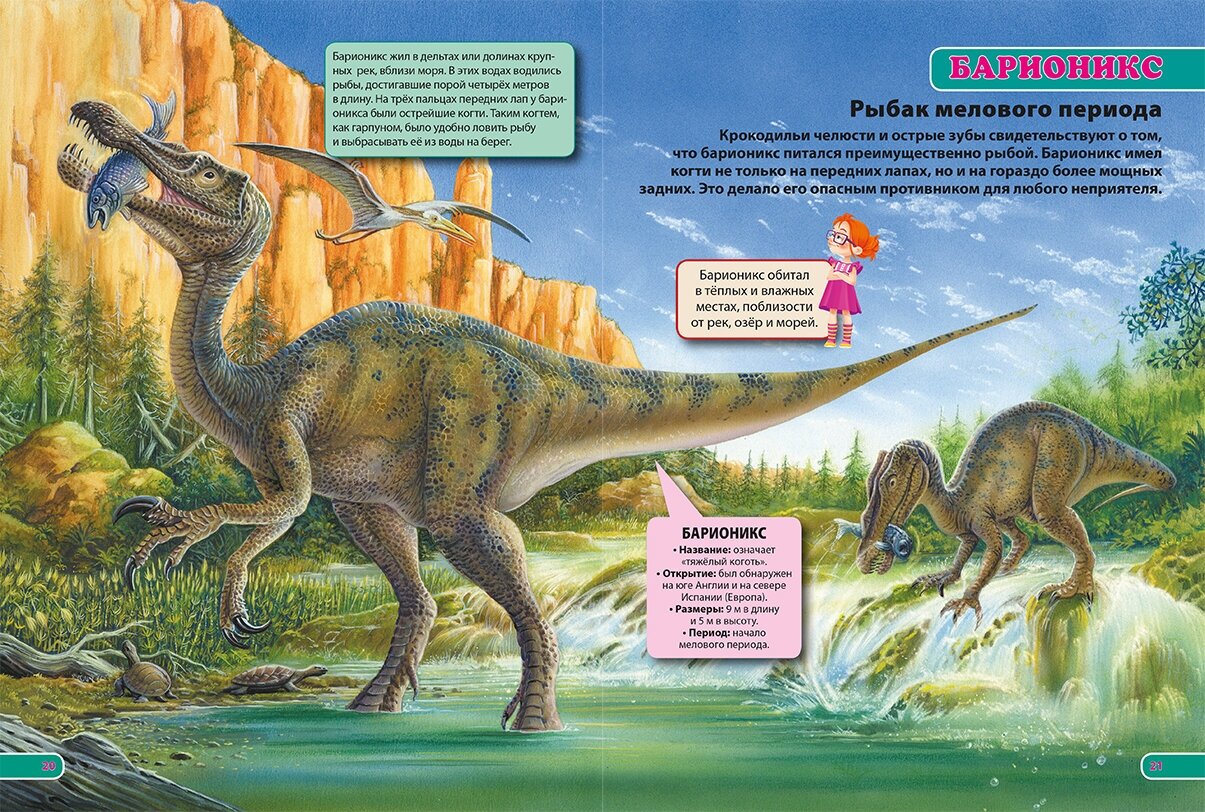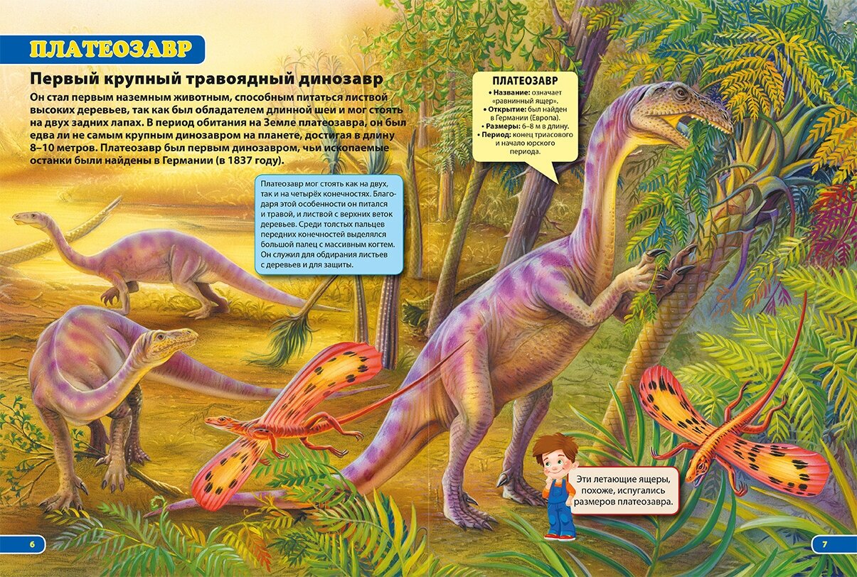 Это, пожалуй, самая красочная энциклопедия про динозавров, которую мы встречали. Это прям не энциклопедия, а просто глянцевый журнал: развороты энциклопедии – это просто одна сплошная иллюстрация. К тому же они настолько яркие и сочные, что просто глаз не оторвать. Именно этим эта энциклопедия и привлекла свое внимание. Плюс реалистичность иллюстраций прекрасная, динозавры выглядят очень натурально. К тому же мне понравилось и реалистичность окружающей обстановки вокруг динозавров.