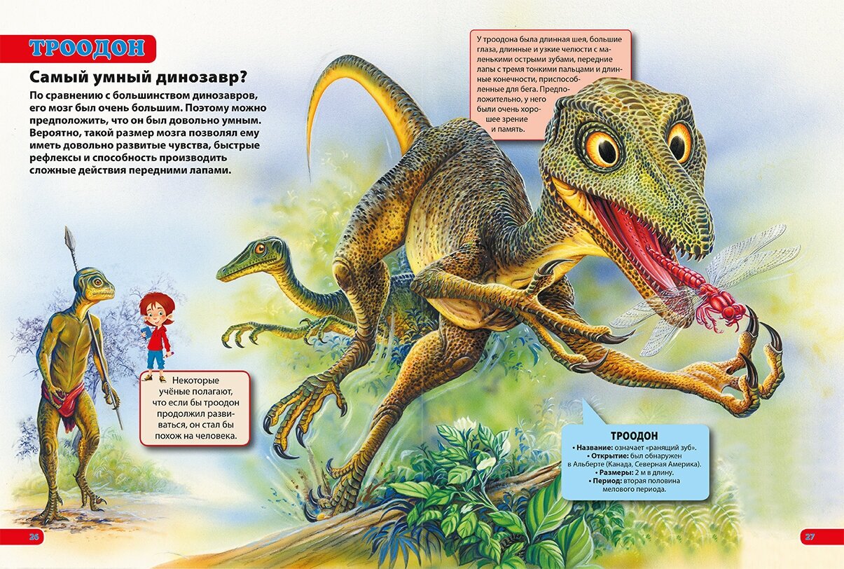 Мир динозавров – загадочен и разнообразен: по древним лесам и просторам бродили огромные апатозавры и юркие велоцирапторы, хищные тираннозавры и травоядные игуанодоны, утконосые гадрозавры и рогатые трицераптопсы. Как жили эти древние ящеры, чем питались, как передвигались и почему исчезли с лица Земли, ты узнаешь на страницах нашей красочной книги. Приглашаем тебя в увлекательное путешествие в мир необычных доисторических рептилий – динозавров!