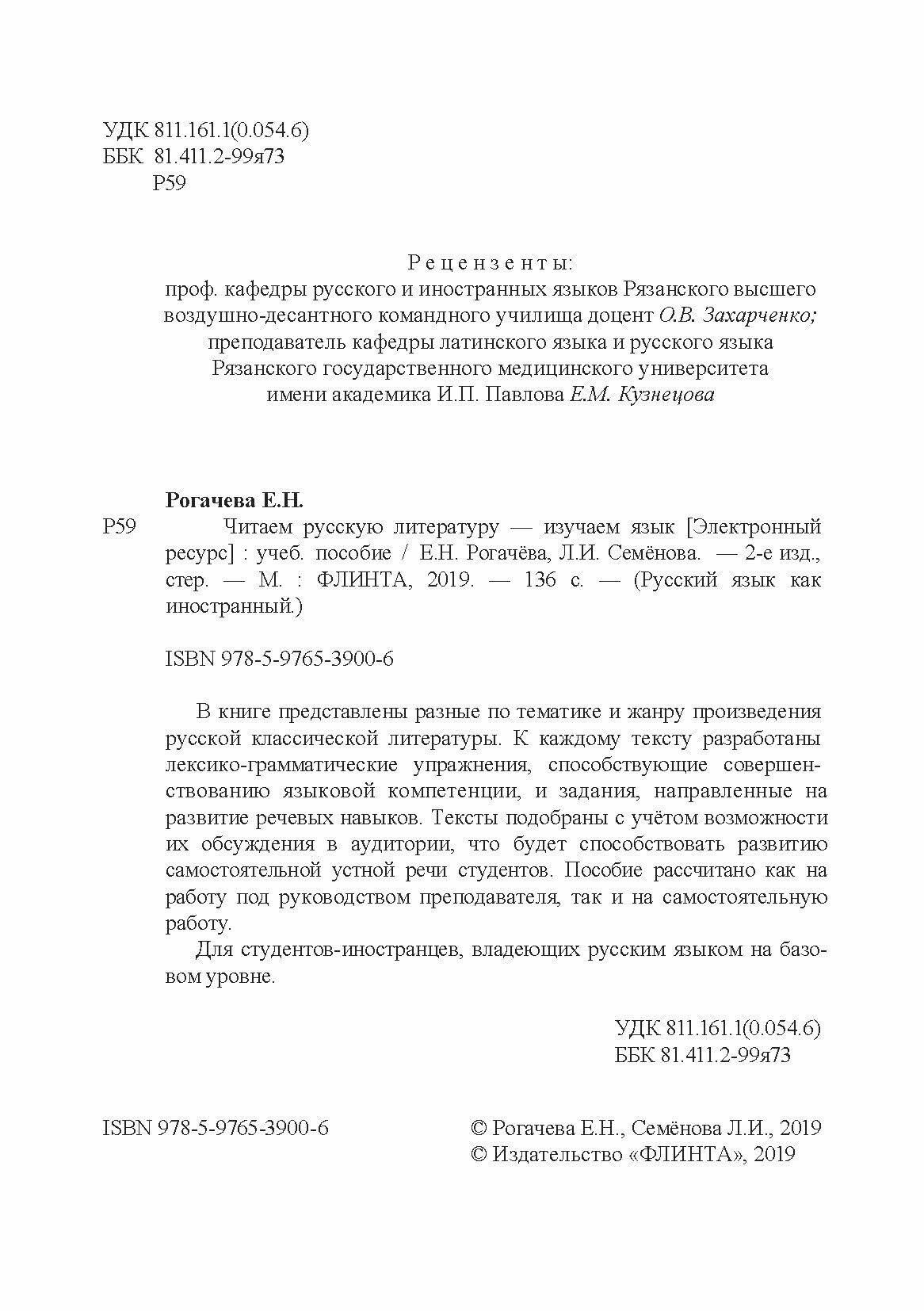 Читаем русскую литературу - изучаем язык. Учебное пособие (Рогачева Елена Николаевна, Семенова Лидия Ивановна); Флинта, 2019
