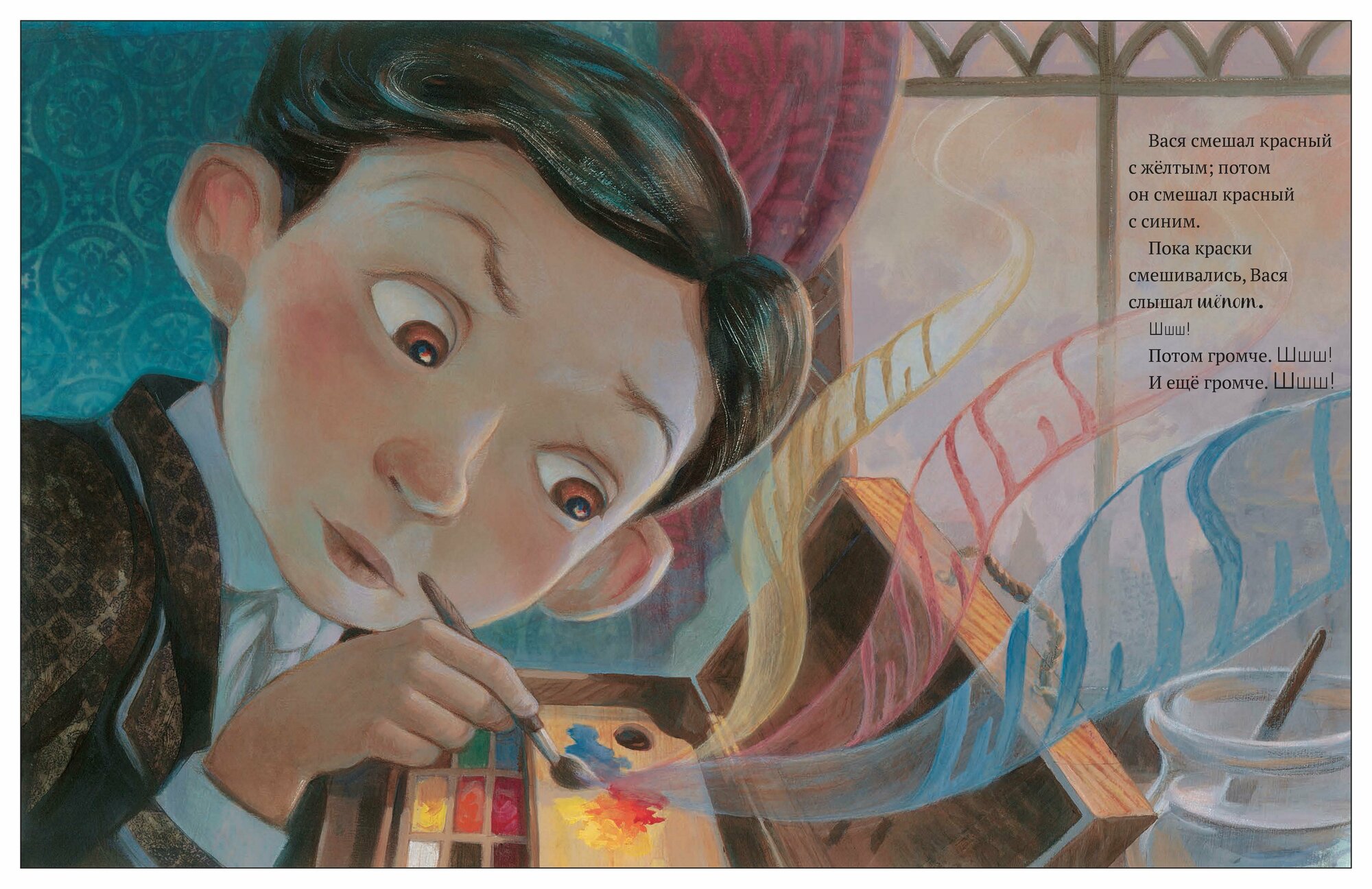 Просто сказка о мальчике Васе. Красиво иллюстрированная сказка. И в конце небольшая биографическая справка о Василии Кандинском с предположением, что у него была синестезия, этим и объясняется, что он слышал цвет. Книга оставила даже не разочарование, а недоумение, детям будет не интересно, взрослым не нужно.
