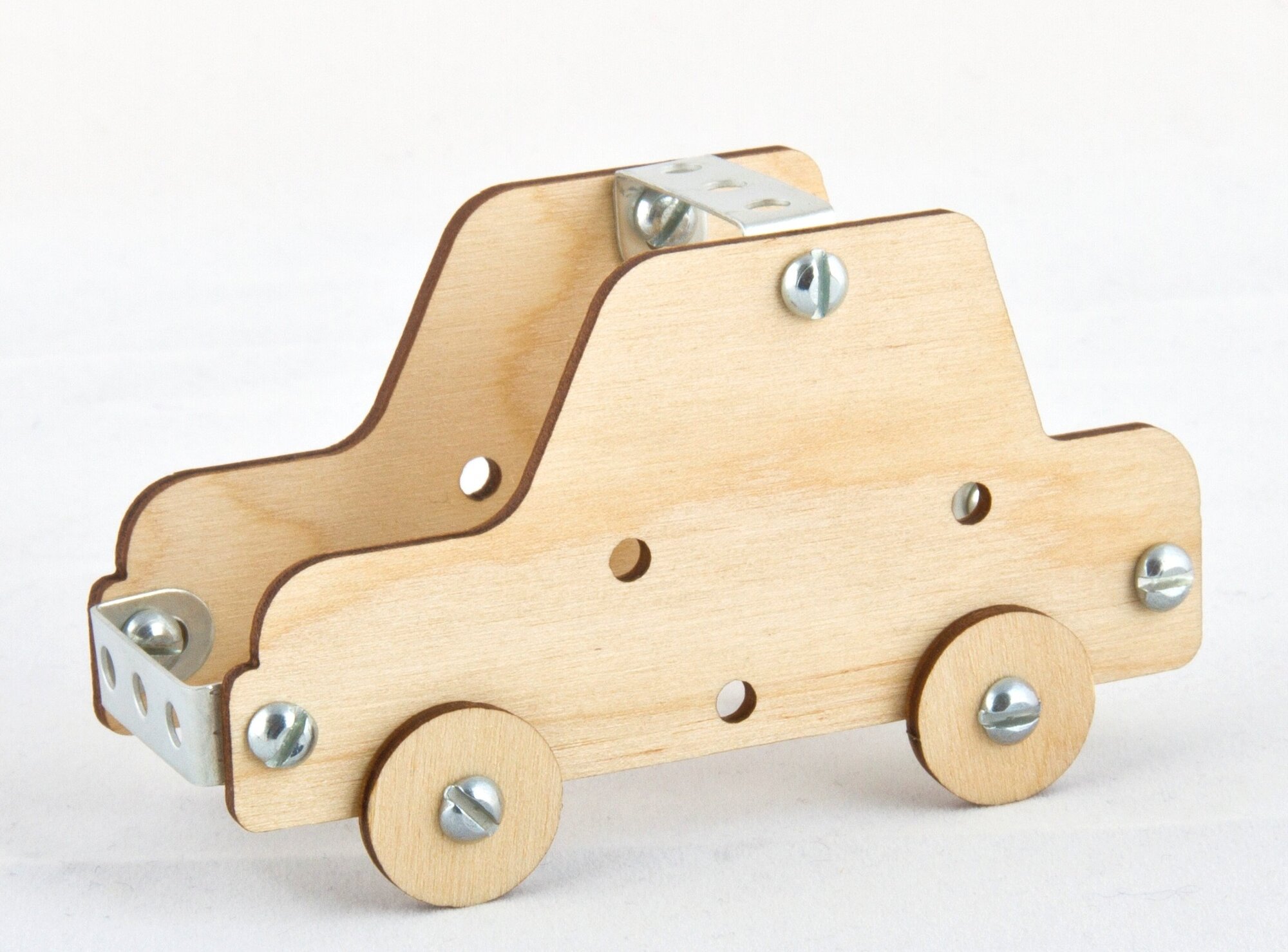 Конструктор Машинка состоит всего из 29 деталей, что позволяет с ним работать даже маленьким деткам. Крупные детальки легко собирать, они не ломаются и не выпадают из рук. Основная часть деталей конструктора деревянная, а соединительные части — металлические. После сборки Машинку можно будет раскрасить по своему вкусу или даже украсить при помощи выжигания.