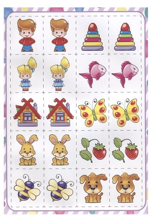 .Карточки-мемори. Задача родителей - аккуратно вырезать карточки, перемешать и выложить на стол "рубашкой" вверх. Задача ребёнка - найти парные карточки. Для этого малыш должен перевернуть любые две карточки изображениями вверх. Если изображения совпадают - карточки убирают, если не совпадают - кладут на прежнее место "рубашкой" вверх, и малыш продолжает поиски. Игра длится до тех пор, пока все парные карточки не будут найдены и выведены из игры.