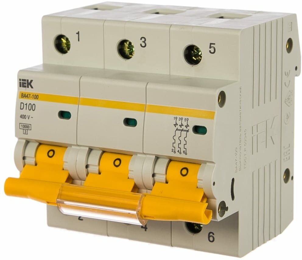 IEK ВА47-100 Автомат 3Р 10А (D) 10kA Автоматический выключатель 3P 10A D 10kA IEK ВА47-100 предназначен для защиты распределительных и групповых цепей, имеющих активную и индуктивную нагрузки. Рекомендуются к применению во вводно-распределительных устройствах бытовых и промышленных электроустановок. Насечки на контактных зажимах снижают тепловые потери и увеличивают механическую устойчивость соединения. Эргономичный дизайн рукоятки включения/выключения облегчает процесс коммутации.