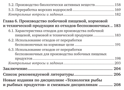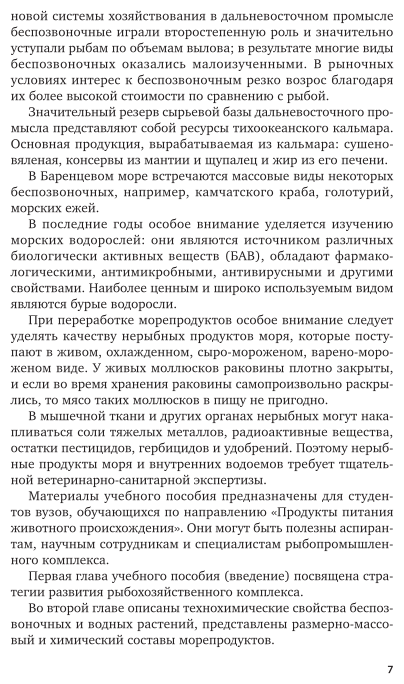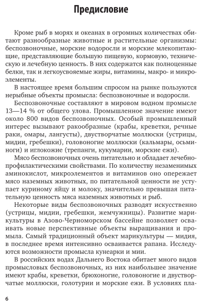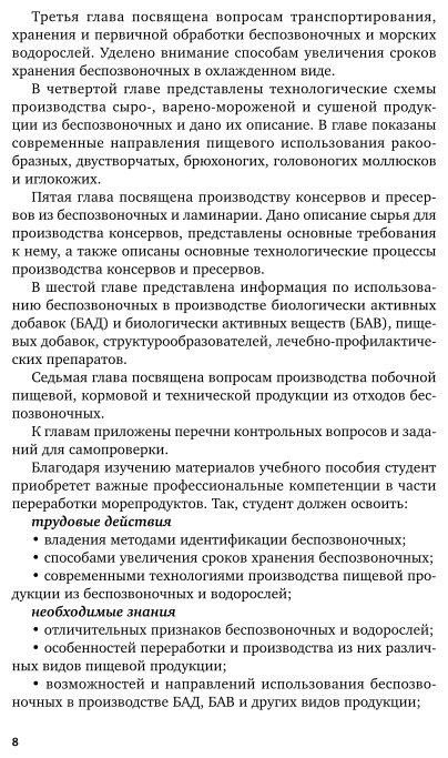 В учебном пособии всесторонне рассмотрены вопросы технологии морепродуктов: приведен материал о стратегии развития рыбохозяйственного комплекса, описаны технохимические свойства беспозвоночных и водных растений, раскрыты особенности транспортирования, хранения и первичной обработки беспозвоночных и морских водорослей, показаны современные направления пищевого использования ракообразных, двустворчатых, брюхоногих, головоногих моллюсков и иглокожих. Описано производство консервов и пресервов из беспозвоночных и ламинарии. Представлена информация по использованию беспозвоночных в производстве биологически активных добавок и биологически активных веществ, пищевых добавок, структурообразователей, лечебно-профилактических препаратов. Раскрыты вопросы производства побочной пищевой, кормовой и технической продукции из отходов беспозвоночных.