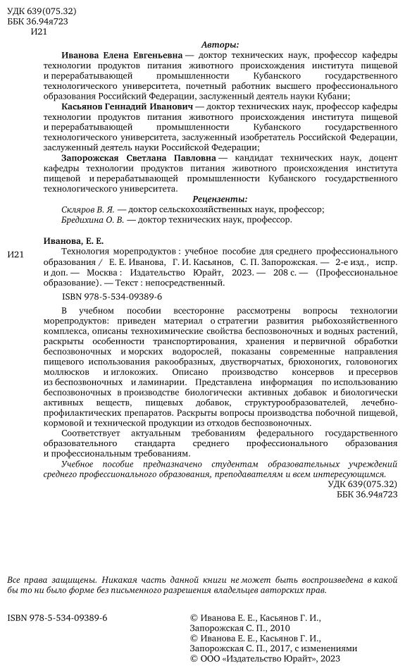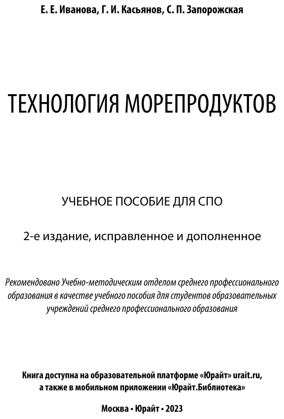 Технология морепродуктов. Учебное пособие для СПО (Иванова Елена Евгеньевна; Касьянов Геннадий Иванович; Запорожская Светлана Павловна); ЮРАЙТ, 2019