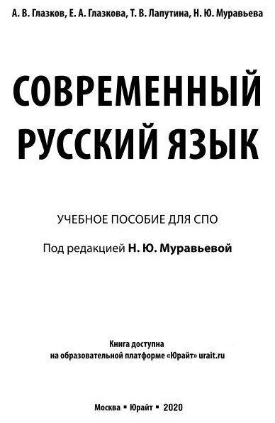 Современный русский язык. Учебное пособие для СПО (Глазков Алексей Владимирович; Глазкова Елена Анатольевна; Лапутина Татьяна Валерьевна; Муравьева Наталия Юрьевна); ЮРАЙТ, 2019
