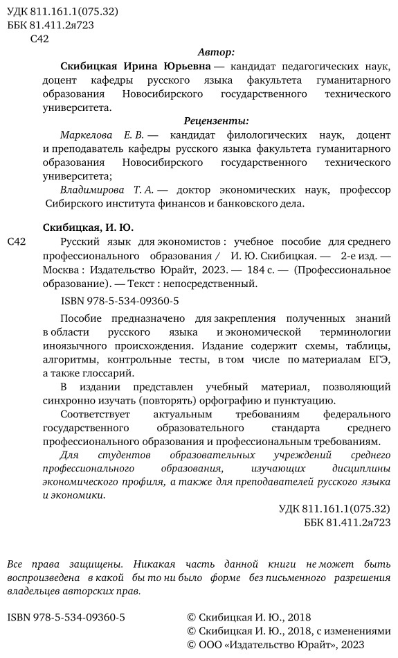 Русский язык для экономистов. Учебное пособие для СПО (Ирина Юрьевна Скибицкая); ЮРАЙТ, 2018